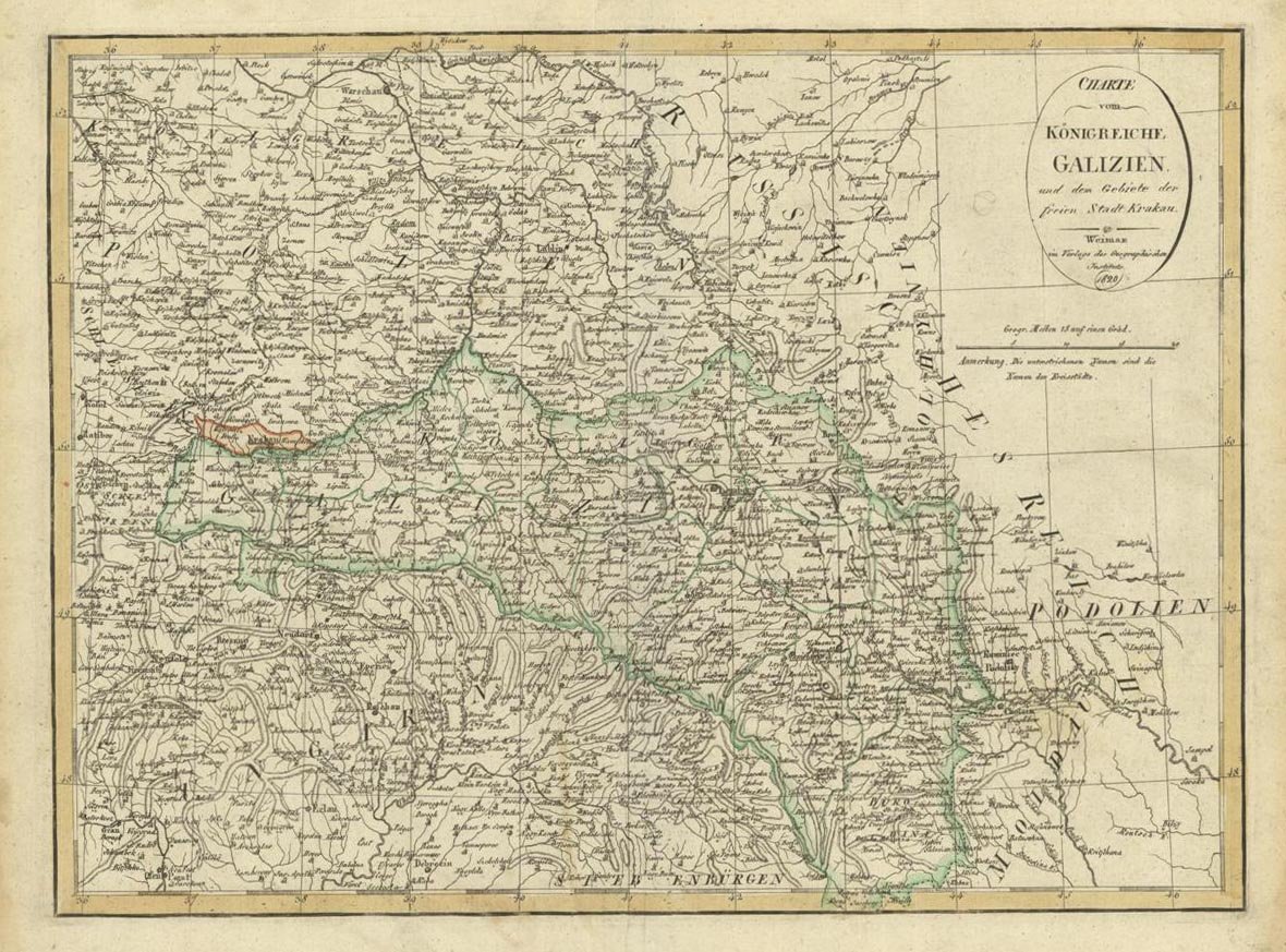 Carta geografica, antica ed originale, con coloritura coeva ai confini. La mappa edita nella città tedesca di Weimar è stata disegnata nel 1820 e rappresenta il territorio della Galizia, regione storica e geografica localizzata al crocevia dell'Europa centrale-orientale e lo stato di Cracovia. Autore: Geograph: Instituts edit. Luogo: Galizia. Anno: 1821. Tecnica: incisione in rame. Dimensioni: 308x417.