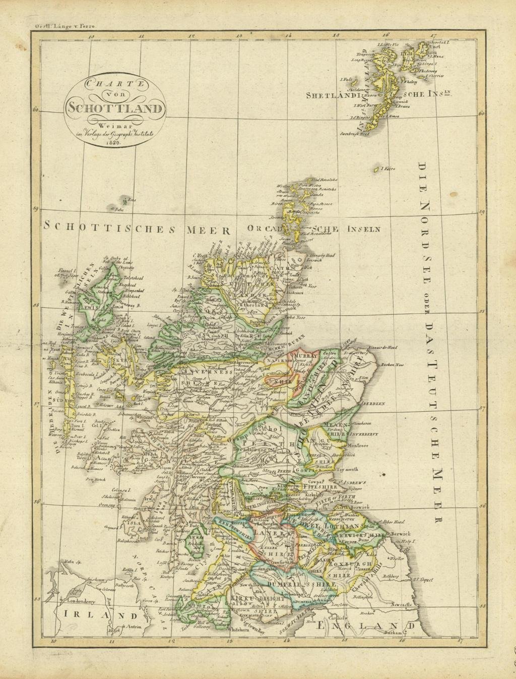 Carta geografica, antica ed originale, con coloritura coeva ai confini. La mappa edita nella città tedesca di Weimar è stata disegnata nel 1820 e rappresenta la Scozia. Autore: Geograph: Instituts edit. Luogo: Scozia. Anno: 1821. Tecnica: incisione in rame. Dimensioni: 415x305.