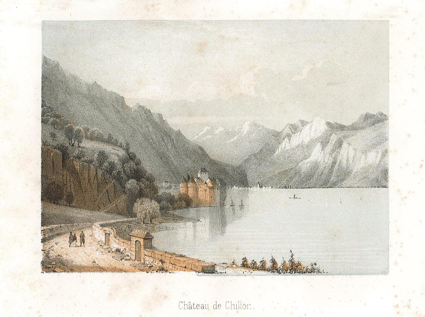 Veduta, antica ed originale, stampata a colori cov veduta del castello di Chillon. Autore: Deroy lith. Luogo: Lago di Ginevra - Chillon. Anno: 1840 ca. Tecnica: litografia. Dimensioni: 100x135.