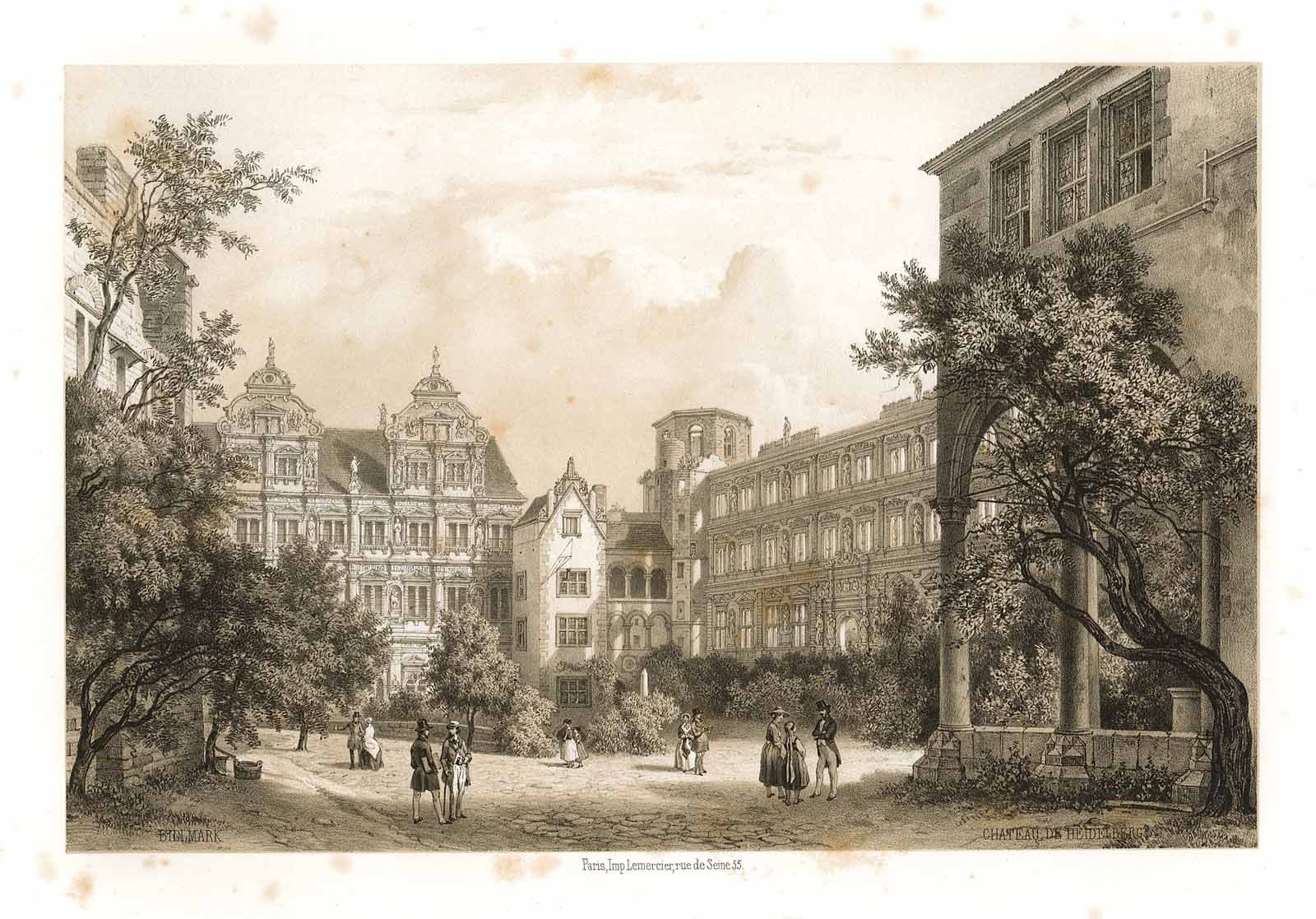 Stampa antica ed originale raffigurante una veduta del castello animata da personaggi, nella cittadina di Heidelberg