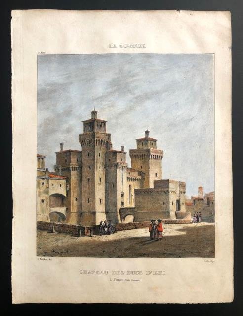 Lith. Légé, 1850 circa. Litografia delineata da H. Duphot e litografata dal Lègér, vecchia coloritura a mano, cm 22 x 29 (il foglio). Si raffigura il castello dei Duchi di Este. Leggera patina di sporco, piacevole e vivace la coloritura. .
