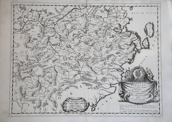 Dettagliata mappa dei territori di Zhejiang e Jiangxi dalla serie di sei mappe che Coronelli dedicò a tredici province cinesi, modellata sulle prime mappe di Joan Blaeu e del gesuita Martino Martini.Sono presenti un cartiglio decorativo con il titolo e uno con le unità di misura, nonché alcune informazioni sulla zona nell'angolo in basso a destra. Opera tratta dal ' Corso geografico universale, o sia la terra divisa nelle sue parti e subdistinta ne' suoi gran regni. Esposta in tavole geografiche ricorrette et accresciute di tutte le nuove scoperte, ad uso dell'Accademia Cosmografica degli Argonauti dal Padre Maestro Vincenzo Coronelli M. C. Cosmografo della Serenissima Republica di Venetia. Dedicata alla Santità di Nostro Signore Innocenzo XII. P. I. In Venetia, a spese dell'autore. MDCXCII. Coronelli visse un periodo di straordinaria fecondità editoriale a partire dal 1689, quando ebbe la cattedra di geografia presso l'Università alle Procuratie, con la pubblicazione, nel 1690, del primo volume dell'Atlante Veneto. In effetti sotto il nome di ' Atlante Veneto ' va tutta la raccolta di tredici opere composte nell'arco del decennio successivo, dall'Isolario ' allo ' Specchio del mare. In realtà solo alcune di tali opere possono definirsi atlante, e sono di valore molto disuguale, dato che si passa da opere originali e fondamentali come quelle citate o il ' Corso Geografico ' ad opere di compilazione o semplici raccolte di vedute. Il ' Corso Geografico ' uscì in diverse edizioni con numeri diversi di carte - sessantotto tavole nel 1689-92; di centosettantatré tavole nel 1692; duecentosessanta tavole, nel 1694-97 - che venivano vendute anche separatamente, al ritmo di sei carte al mese per due anni. Le carte furono incise tra il 1688 e il 1692 nell'attrezzatissima officina cartografica del convento dei Frari, dove lavoravano anche incisori stranieri. ' Impressive map of Zhejiang and Jiangxi from Coronelli's set of six maps showing thirteen Chinese provinces, is modeled on the earlier maps by Joan Blaeu and the Jesuit Martino Martini.With decorative scale cartouche as well as some information about the area in the lower right corner. The map is taken from ' Corso geografico universale, o sia la terra divisa nelle sue parti e subdistinta ne' suoi gran regni. Esposta in tavole geografiche ricorrette et accresciute di tutte le nuove scoperte, ad uso dell'Accademia Cosmografica degli Argonauti dal Padre Maestro Vincenzo Coronelli M. C. Cosmografo della Serenissima Republica di Venetia. Dedicata alla Santità di Nostro Signore Innocenzo XII. P. I. In Venetia, a spese dell'autore. MDCXCII. Coronelli lived a period of extraordinary editorial fecundity starting from 1689, when he had the chair of geography at the University at the Procuratie, with the publication, in 1690, of the first volume of the ' Atlante Veneto. Under the name of ' Atlante Veneto ' goes the entire collection of thirteen works composed over the next decade, from the ' Isolario ' to the ' Specchio del mare. ' In reality, only some of these works can be defined as atlas, and are of very unequal value, since we go from original and fundamental works such as those mentioned or the ' Corso Geografico ' to works of compilation or simple collections of views. The ' Corso Geografico ' came out in several editions with different numbers of maps - sixty-eight maps in 1689-92; one hundred and seventy-three maps in 1692; two hundred and sixty maps in 1694-97 - which were also sold separately, at the rate of six a month for two years. The maps were alle engraved between 1688 and 1692 in the well-equipped cartographic workshop of the Frari convent, where foreign engravers also worked. ' Cfr.
