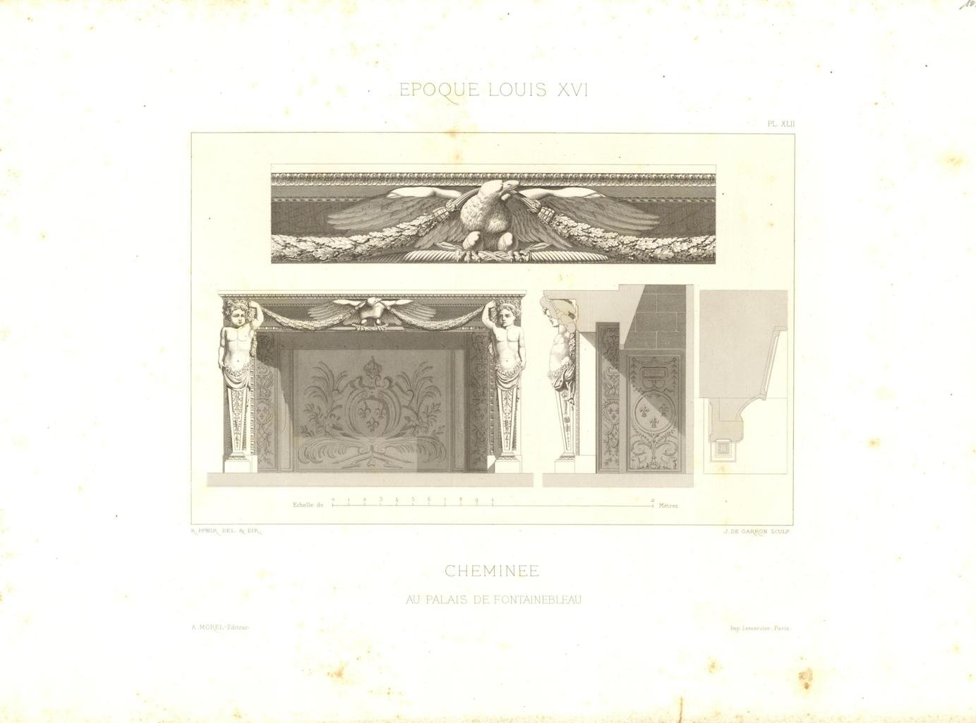 Incisione, antica ed originale, riproducente architetture all'Epoque de Louis XVI re di Francia dal 1774 al 1792. Autore: Pfnor M. Rodolphe delineò & diresse. Luogo: Fontainebleau Palazzo. Anno: 1865. Tecnica: incisione su lastra di rame. Dimensioni: 360x510 mm il foglio.