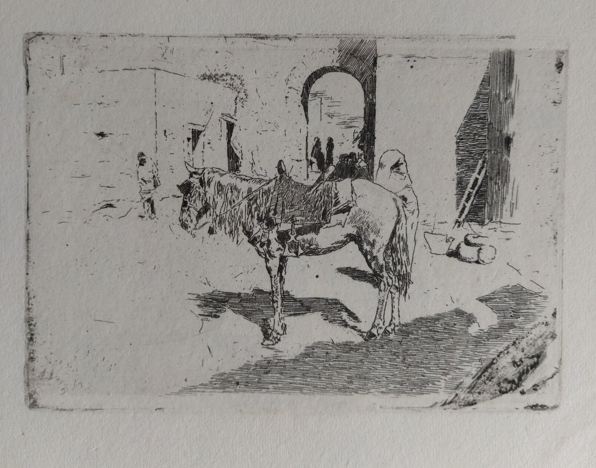 In questa stampa, la numero 20 del catalogo, Fortuny sembra realizzare una sorta di ritratto dal vero, un rapido schizzo sul posto. In realtà si conosce per questa stampa un disegno preparatorio. La scena è immobile, una forte luce solare lascia poco spazio a nette zone d’ombra. Un cavallo di profilo, è fermo al centro di una strada o di una piazza, con la sella montata, i paraocchi e le briglie. Appena oltre l'animale, a destra, vediamo un uomo, un arabo stante avvolto nel suo caftano al suo fianco due grandi vasi in terracotta e una scala. Chiude la scena una quinta architettonica: a sinistra il profilo squadrato di un abitazione alla quale si appoggia un uomo, al centro un arco oltre il quale sembra aprirsi una strada e si scorgono delle persone avvolte nell'ombra, a destra un alto muro bianco.