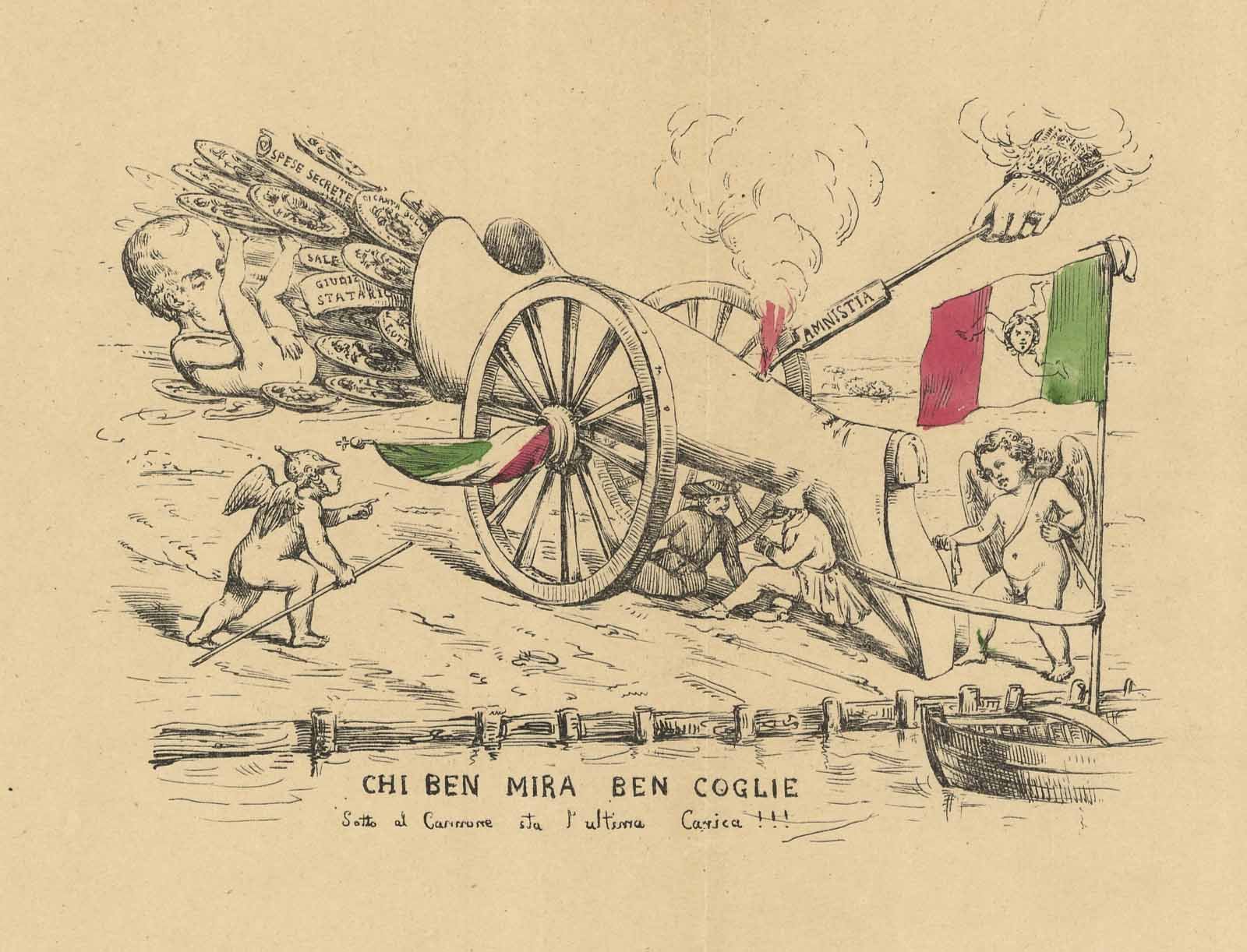 Pio IX con la concessione dell'amnistia del luglio 1846 dà fuoco al cannone (lo stivale d'Italia) che esplode colpendo Ferdinando I d'Austria con proiettili formati da monete asburgiche. Un putto lega la Sicilia (raffigurata da una barca con bandiera tricolore e insegna della Trinacria) al piede dello stivale. Un altro putto arriva con una nuova e indica un gesuita e Pulcinella (il Regno di Napoli) per il momento seduti al riparo, ma che verranno colpiti con l'ultima carica.Rif: "Il ruggito del Leone 150 stampe satiriche 1797-1860", p. 41, n° 132