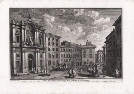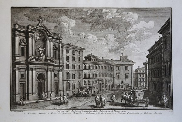 Veduta tratta dalla monumentale opera ' Delle magnificenze di Roma antica e moderna.Pubblicata in 10 volumi dal 1747 al 1761, l’opera presenta 238 incisioni in rame, ciascuna incisione con testo narrativo che fornisce informazioni storiche e documentarie. ' Conosciuto dai più semplicemente come il "maestro" di Giovanni Battista Piranesi, Giuseppe Vasi rivela in quest'opera monumentale la pienezza della sua creatività grafica. I 10 libri che la compongono hanno ognuno un frontespizio con titolo e data diversi: ' Libro primo che contiene le porte e mura; Libro secondo, che contiene le piazze principali di Roma con obelischi, colonne, ed altri ornamenti; Libro terzo, che contiene le basiliche e chiese antiche di Roma; Libro quarto che contiene i palazzi e le vie più celebri; Libro quinto che contiene i ponti e gli edifizj sul Libro sesto che contiene la chiese parrocchiali; Libro settimo che contiene i conventi e case dei chierici regolari; Libro ottavo che contiene i monasteri e conservatorj di donne; Libro nono che contiene i collegj, spedali, e luoghi pii; decimo che contiene le ville e giardini più rimarchevoli. Le ' Magnificenze ' forniscono un panorama completo e al tempo stesso anticonvenzionale dell'Urbe: così, insieme alle consuete, celeberrime inquadrature desunte dalla migliore tradizione vedutistica, si trova anche una Roma insolita, quella che, talvolta, non esiste più. A quest'opera, di centrale importanza nell'editoria romana di metà Settecento, l'Autore aveva lavorato per quasi un ventennio realizzando una monumentale guida dell'Urbe dove accanto alle consuete e celeberrime inquadrature tratte dalla migliore tradizione vedutistica, immortala anche scorci insoliti che sono poi scomparsi con il cambiare della città. Il testo che accompagna le vedute nel primo volume è opera di Giuseppe Bianchini, nel secondo di Orazio Orlandi e nei restanti del Vasi stesso. A partire dall'edizione del 1786, l'opera del Vasi, fu aggiornata dal figlio Mariano, che la pubblicò col titolo ' Raccolta delle più belle vedute antiche, e moderne di Roma, mostrando solo il nome del padre come autore. Questa nuova edizione presentava molte tavole della prima edizione, ed alcune nuove. Anche la pubblicazione di Mariano Vasi fu stampata più volte, sempre con l’aggiunta di nuove tavole. Esemplare tratto dalla seconda edizione del 1772.La tavola come riporta la didascalia, raffigura anche: 1. Palazzo Strozzi, 2. Parte del Palazzo Cesarini, 3. Palazzo già de Cenci, ora Collegio Calasanzio, 4. Palazzo Amedei Acquaforte, stampata su carta vergata coeva, completa dei margini, in ottimo stato di conservazione. ' View taken from the monumental work ' Delle magnificenze di Roma antica e moderna. Published in 10 volumes from 1747 to 1761, the work features 238 copper engravings, each engraving with a narrative text that provides historical and documentary information. Known by most simply as the "master" of Giovanni Battista Piranesi, Giuseppe Vasi reveals in this monumental work the fullness of his graphic creativity. The 10 books that compose it each have a title page with a different title and date: ' Libro primo che contiene le porte e mura; Libro secondo, che contiene le piazze principali di Roma con obelischi, colonne, ed altri ornamenti; Libro terzo, che contiene le basiliche e chiese antiche di Roma; Libro quarto che contiene i palazzi e le vie più celebri; Libro quinto che contiene i ponti e gli edifizj sul Libro sesto che contiene la chiese parrocchiali; Libro settimo che contiene i conventi e case dei chierici regolari; Libro ottavo che contiene i monasteri e conservatorj di donne; Libro nono che contiene i collegj, spedali, e luoghi pii; decimo che contiene le ville e giardini più rimarchevoli. The ' Magnificences ' provide a complete and at the same time unconventional panorama of the City: thus, together with the usual, celebrated shots taken from the best tradition of ' vedutistica, one also finds an unusual Rome, one that, at times, no longer exists. The author had worked on this work, of central importance in Roman publishing in the middle of the eighteenth century, for almost twenty years, producing a monumental guide to the “Urbe” where, alongside the usual and famous shots taken from the best tradition of ' vedutistica, he also immortalized unusual views that have since disappeared with the change of the city. The text that accompanies the views in the first volume is by Giuseppe Bianchini, in the second by Orazio Orlandi and in the remaining ones by Vasi himself. Starting from the edition of 1786, the work of Vasi, was updated by his son Mariano, who published it under the title ' Raccolta delle più belle vedute antiche, e moderne di Roma, showing only the name of his father as author. This new edition presented many plates of the first edition, and some new ones. The publication of Mariano Vasi was also printed several times, always with the addition of new plates. ' View taken from the second edition of the Vasi’s ' Delle Magnificenze di Roma Antica e Moderna ' (first edition, in X books, published between 1747-61), edited in 1772. Etching, printed on contemporary laid paper, in very good condition. Cfr. Scalabroni, 280