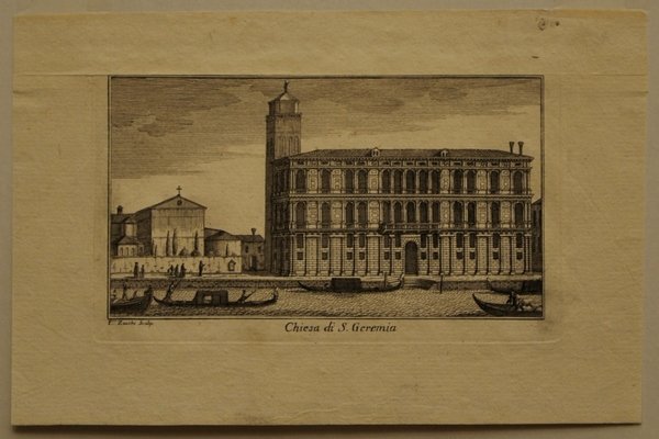 Acquaforte di mm 130 x 75 (alla battuta). Carta vergata forte. Foglio senza difetti e a pieni margini. Proveniente dalle "Teatro delle fabbriche piu cospicue in prospettiva, della citta di Venezia. Tomo primo (-secondo)". (Venezia): nella stamperia di Giambatista Albrizzi q. Gir., (1740). Francesco Zucchi (1692-1764): il più dotato incisore della famiglia, divenne molto celebre per la illustrazione della guida più celebre del '700 veneziano.