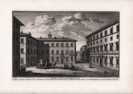 Veduta tratta dalla monumentale opera ' Delle magnificenze di Roma antica e moderna.Pubblicata in 10 volumi dal 1747 al 1761, l’opera presenta 238 incisioni in rame, ciascuna incisione con testo narrativo che fornisce informazioni storiche e documentarie. ' Conosciuto dai più semplicemente come il "maestro" di Giovanni Battista Piranesi, Giuseppe Vasi rivela in quest'opera monumentale la pienezza della sua creatività grafica. I 10 libri che la compongono hanno ognuno un frontespizio con titolo e data diversi: ' Libro primo che contiene le porte e mura; Libro secondo, che contiene le piazze principali di Roma con obelischi, colonne, ed altri ornamenti; Libro terzo, che contiene le basiliche e chiese antiche di Roma; Libro quarto che contiene i palazzi e le vie più celebri; Libro quinto che contiene i ponti e gli edifizj sul Libro sesto che contiene la chiese parrocchiali; Libro settimo che contiene i conventi e case dei chierici regolari; Libro ottavo che contiene i monasteri e conservatorj di donne; Libro nono che contiene i collegj, spedali, e luoghi pii; decimo che contiene le ville e giardini più rimarchevoli. Le ' Magnificenze ' forniscono un panorama completo e al tempo stesso anticonvenzionale dell'Urbe: così, insieme alle consuete, celeberrime inquadrature desunte dalla migliore tradizione vedutistica, si trova anche una Roma insolita, quella che, talvolta, non esiste più. A quest'opera, di centrale importanza nell'editoria romana di metà Settecento, l'Autore aveva lavorato per quasi un ventennio realizzando una monumentale guida dell'Urbe dove accanto alle consuete e celeberrime inquadrature tratte dalla migliore tradizione vedutistica, immortala anche scorci insoliti che sono poi scomparsi con il cambiare della città. Il testo che accompagna le vedute nel primo volume è opera di Giuseppe Bianchini, nel secondo di Orazio Orlandi e nei restanti del Vasi stesso. A partire dall'edizione del 1786, l'opera del Vasi, fu aggiornata dal figlio Mariano, che la pubblicò col titolo ' Raccolta delle più belle vedute antiche, e moderne di Roma, mostrando solo il nome del padre come autore. Questa nuova edizione presentava molte tavole della prima edizione, ed alcune nuove. Anche la pubblicazione di Mariano Vasi fu stampata più volte, sempre con l’aggiunta di nuove tavole. Esemplare tratto dalla seconda edizione del 1772. Acquaforte, stampata su carta vergata coeva, completa dei margini, in ottimo stato di conservazione. ' View taken from the monumental work ' Delle magnificenze di Roma antica e moderna. Published in 10 volumes from 1747 to 1761, the work features 238 copper engravings, each engraving with a narrative text that provides historical and documentary information. Known by most simply as the "master" of Giovanni Battista Piranesi, Giuseppe Vasi reveals in this monumental work the fullness of his graphic creativity. The 10 books that compose it each have a title page with a different title and date: ' Libro primo che contiene le porte e mura; Libro secondo, che contiene le piazze principali di Roma con obelischi, colonne, ed altri ornamenti; Libro terzo, che contiene le basiliche e chiese antiche di Roma; Libro quarto che contiene i palazzi e le vie più celebri; Libro quinto che contiene i ponti e gli edifizj sul Libro sesto che contiene la chiese parrocchiali; Libro settimo che contiene i conventi e case dei chierici regolari; Libro ottavo che contiene i monasteri e conservatorj di donne; Libro nono che contiene i collegj, spedali, e luoghi pii; decimo che contiene le ville e giardini più rimarchevoli. The ' Magnificences ' provide a complete and at the same time unconventional panorama of the City: thus, together with the usual, celebrated shots taken from the best tradition of ' vedutistica, one also finds an unusual Rome, one that, at times, no longer exists. The author had worked on this work, of central importance in Roman publishing in the middle of the eighteenth century, for almost twenty years, producing a monumental guide to the “Urbe” where, alongside the usual and famous shots taken from the best tradition of ' vedutistica, he also immortalized unusual views that have since disappeared with the change of the city. The text that accompanies the views in the first volume is by Giuseppe Bianchini, in the second by Orazio Orlandi and in the remaining ones by Vasi himself. Starting from the edition of 1786, the work of Vasi, was updated by his son Mariano, who published it under the title ' Raccolta delle più belle vedute antiche, e moderne di Roma, showing only the name of his father as author. This new edition presented many plates of the first edition, and some new ones. The publication of Mariano Vasi was also printed several times, always with the addition of new plates. ' View taken from the second edition of the Vasi’s ' Delle Magnificenze di Roma Antica e Moderna ' (first edition, in X books, published between 1747-61), edited in 1772. Etching, printed on contemporary laid paper, in very good condition. Cfr. Scalabroni 202