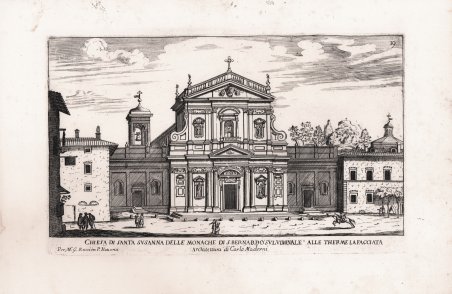 Da un'incisione di Giovan Battista Falda Veduta della serie Il nuovo splendore delle fabriche in prospettiva di Roma moderna : fatte restaurare dalla fel. mem. di Papa Alessandro VII : nuouamente intagliato sotto il felice pontificato di N.S. Papa Innocentio XI copiate dalle stampe di gia intagliate da Gio. Batt. Falda da Valdugia; da Matteo Gregorio Rossi, Romano . [Matteo Gregorio Rossi] in Piazza Nauona all' insegna della Stampa, l'anno 1686 [-1688], edita in 3 volumi tra il 1686-1688, da Matteo Gregorio de Rossi. Dopo l'incredibile successo de del Il nuovo teatro delle fabriche, et edificii, in prospettiva di Roma moderna. Libro primo (secondo, terzo) opera in 3 volumi, con le incisioni di Giovanni Battista Falda, edita da Gian Giacomo de Rossi della tipografia alla Pace, tra il 1665 e il 1669, la tipografia dei De Rossi con sede in piazza Navona, all’epoca diretta da Matteo Gregorio, tentò un'operazione commerciale allora ben diffusa: pubblicare un’opera analoga che potesse concorrere con quella del Falda. Nascono così i 3 volumi de Il nuovo splendore, editi tra il 1686 e il 1688, con incisioni realizzate da Giuseppe Tiburzio Vergelli copiando quelle del Falda, o imitandone lo stile in quelle di sua creazione originale. L’opera viene dedicata a Urbano Barberini, principe di Palestrina; nel titolo si dichiara apertamente la fonte delle tavole: copiate dalle stampe di gia intagliate da Gio. Batt. Falda da Valdugia. Un quarto volume contenente le fontane di Roma, sempre copiate da Falda, esce nel 1690 con il titolo Le fontane pubbliche delle piazze di Roma disegnate da Gioseppe Triburno Vergelli relanatese intagliate da Pietro Paolo Girelli Romano. Acquaforte, stampata su carta vergata coeva, con margini, in ottimo stato di conservazione. After Giovanni Battista Falda. View of the series Il nuovo splendore delle fabriche in prospettiva di Roma moderna : fatte restaurare dalla fel. mem. di Papa Alessandro VII : nuouamente intagliato sotto il felice pontificato di N.S. Papa Innocentio XI copiate dalle stampe di gia intagliate da Gio. Batt. Falda da Valdugia; da Matteo Gregorio Rossi, Romano . [Matteo Gregorio Rossi] in Piazza Nauona all' insegna della Stampa, the year 1686 [-1688], published in 3 volumes between 1686-1688, by Matteo Gregorio de Rossi. After the incredible success of Il nuovo teatro delle fabriche, et edificii, in prospettiva di Roma moderna. Libro primo (secondo, terzo) a work in 3 volumes, with engravings by Giovanni Battista Falda, published by Gian Giacomo de Rossi of the Tipografia alla Pace, between 1665 and 1669, the De Rossi printing house in Piazza Navona, directed at the time by Matteo Gregorio, attempted a commercial operation that was then widespread: to publish a similar work that could compete with that of Falda. Thus were born the 3 volumes of Il nuovo splendore, published between 1686 and 1688, with engravings made by Giuseppe Tiburzio Vergelli copying those of Falda, or imitating the style in those of his original creation. The work is dedicated to Urbano Barberini, prince of Palestrina; the title openly declares the source of the plates: copiate dalle stampe di gia intagliate da Gio. Batt. Falda da Valdugia. A fourth volume containing the fountains of Rome, again copied by Falda, came out in 1690 with the title Le fontane pubbliche delle piazze di Roma disegnate da Gioseppe Triburno Vergelli relanatese intagliate da Pietro Paolo Girelli Romano. Etching, printed on contemporary laid paper, with margins, in excellent condition. Cfr. Rossetti 11301. Kissner 454.