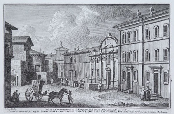 Veduta tratta dalla monumentale opera ' Delle magnificenze di Roma antica e moderna.Pubblicata in 10 volumi dal 1747 al 1761, l’opera presenta 238 incisioni in rame, ciascuna incisione con testo narrativo che fornisce informazioni storiche e documentarie. ' Conosciuto dai più semplicemente come il "maestro" di Giovanni Battista Piranesi, Giuseppe Vasi rivela in quest'opera monumentale la pienezza della sua creatività grafica. I 10 libri che la compongono hanno ognuno un frontespizio con titolo e data diversi: ' Libro primo che contiene le porte e mura; Libro secondo, che contiene le piazze principali di Roma con obelischi, colonne, ed altri ornamenti; Libro terzo, che contiene le basiliche e chiese antiche di Roma; Libro quarto che contiene i palazzi e le vie più celebri; Libro quinto che contiene i ponti e gli edifizj sul Libro sesto che contiene la chiese parrocchiali; Libro settimo che contiene i conventi e case dei chierici regolari; Libro ottavo che contiene i monasteri e conservatorj di donne; Libro nono che contiene i collegj, spedali, e luoghi pii; decimo che contiene le ville e giardini più rimarchevoli. Le ' Magnificenze ' forniscono un panorama completo e al tempo stesso anticonvenzionale dell'Urbe: così, insieme alle consuete, celeberrime inquadrature desunte dalla migliore tradizione vedutistica, si trova anche una Roma insolita, quella che, talvolta, non esiste più. A quest'opera, di centrale importanza nell'editoria romana di metà Settecento, l'Autore aveva lavorato per quasi un ventennio realizzando una monumentale guida dell'Urbe dove accanto alle consuete e celeberrime inquadrature tratte dalla migliore tradizione vedutistica, immortala anche scorci insoliti che sono poi scomparsi con il cambiare della città. Il testo che accompagna le vedute nel primo volume è opera di Giuseppe Bianchini, nel secondo di Orazio Orlandi e nei restanti del Vasi stesso. A partire dall'edizione del 1786, l'opera del Vasi, fu aggiornata dal figlio Mariano, che la pubblicò col titolo ' Raccolta delle più belle vedute antiche, e moderne di Roma, mostrando solo il nome del padre come autore. Questa nuova edizione presentava molte tavole della prima edizione, ed alcune nuove. Anche la pubblicazione di Mariano Vasi fu stampata più volte, sempre con l’aggiunta di nuove tavole. Esemplare tratto dalla seconda edizione del 1772. Acquaforte, stampata su carta vergata coeva, completa dei margini, in ottimo stato di conservazione. ' View taken from the monumental work ' Delle magnificenze di Roma antica e moderna. Published in 10 volumes from 1747 to 1761, the work features 238 copper engravings, each engraving with a narrative text that provides historical and documentary information. Known by most simply as the "master" of Giovanni Battista Piranesi, Giuseppe Vasi reveals in this monumental work the fullness of his graphic creativity. The 10 books that compose it each have a title page with a different title and date: ' Libro primo che contiene le porte e mura; Libro secondo, che contiene le piazze principali di Roma con obelischi, colonne, ed altri ornamenti; Libro terzo, che contiene le basiliche e chiese antiche di Roma; Libro quarto che contiene i palazzi e le vie più celebri; Libro quinto che contiene i ponti e gli edifizj sul Libro sesto che contiene la chiese parrocchiali; Libro settimo che contiene i conventi e case dei chierici regolari; Libro ottavo che contiene i monasteri e conservatorj di donne; Libro nono che contiene i collegj, spedali, e luoghi pii; decimo che contiene le ville e giardini più rimarchevoli. The ' Magnificences ' provide a complete and at the same time unconventional panorama of the City: thus, together with the usual, celebrated shots taken from the best tradition of ' vedutistica, one also finds an unusual Rome, one that, at times, no longer exists. The author had worked on this work, of central importance in Roman publishing in the middle of the eighteenth century, for almost twenty years, producing a monumental guide to the “Urbe” where, alongside the usual and famous shots taken from the best tradition of ' vedutistica, he also immortalized unusual views that have since disappeared with the change of the city. The text that accompanies the views in the first volume is by Giuseppe Bianchini, in the second by Orazio Orlandi and in the remaining ones by Vasi himself. Starting from the edition of 1786, the work of Vasi, was updated by his son Mariano, who published it under the title ' Raccolta delle più belle vedute antiche, e moderne di Roma, showing only the name of his father as author. This new edition presented many plates of the first edition, and some new ones. The publication of Mariano Vasi was also printed several times, always with the addition of new plates. ' View taken from the second edition of the Vasi’s ' Delle Magnificenze di Roma Antica e Moderna ' (first edition, in X books, published between 1747-61), edited in 1772. Etching, printed on contemporary laid paper, in very good condition. Cfr. Scalabroni 160
