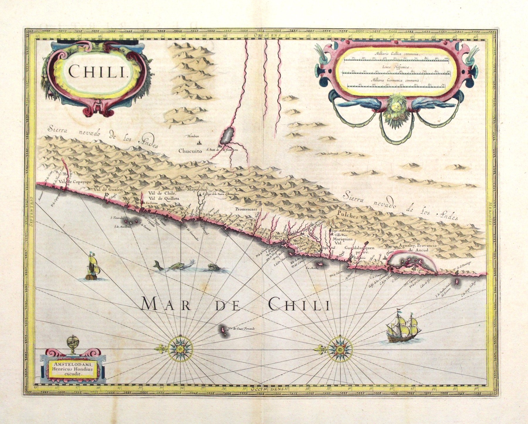 Incisione in rame, dipinta d'epoca, mm 375x485. Piacevole carta del Cile arrichita da cartigli, rose dei venti e vascelli. Henricus, dopo l'acquisizione delle lastre di Mercatore da parte di suo padre Jodocus fu colui che guidò l'impresa editoriale, fino al 1646, quando il suo nome non apparirà più su alcun frontespizio, sostituito sempre da quello di Janssonius; la società fra Hondius e Janssonius risultò così divenire il grande avversario della famiglia Blaeu nel secolo d'oro della cartografia olandese. Perfetto esemplare marginosissimo. <BR>Copper engraving, original color mm 385x488; Fascinating map of Perù embellished by a wind rose end galleons. <BR><BR>