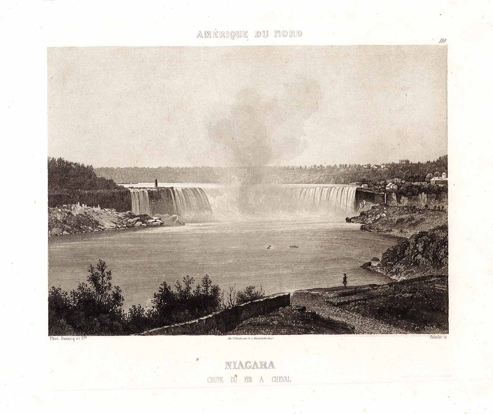 Stampa, antica ed originale, con veduta delle cascate. Inserita nell'opera "Excursions photographiques. Vues et monuments les plus remarquables de l'univers.". Parigi 1863. Autore: Salathé sculp. Luogo: Niagara cascate. Anno: 1863. Tecnica: acquatinta. Dimensioni: 270x370 il foglio.