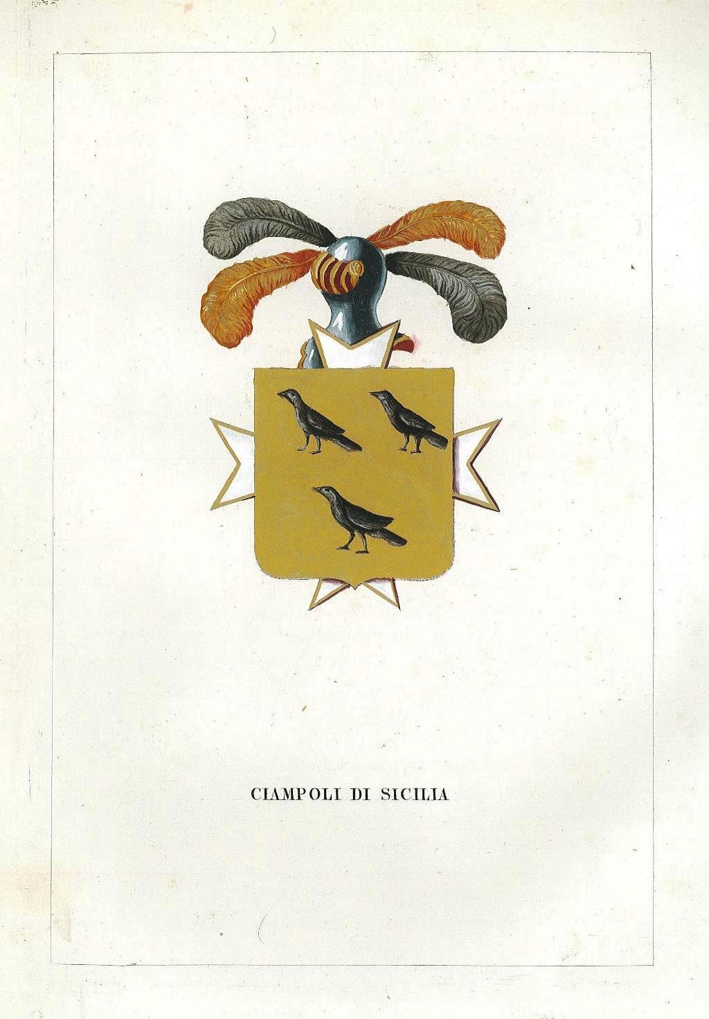 Stemma araldico della famiglia, finemente colorato a mano all'epoca con vivace acquerellatura a tempera. Inserita in una delle più importanti opere sull'araldica italiana in cui sono descritte ben 459 famiglie. L'opera è composta da bellissime incisioni di stemmi nobiliari in coloritura coeva e descrizioni genealogiche delle più importanti famiglie. Inserita nell'opera "Teatro araldico ovvero raccolta generale delle armi ed insegne gentilizie delle più illustri e nobili casate che sisterono un tempo e che tuttora fioriscono in tutta l'Italia. illustrate con relative genealogico-storiche nozioni da L. Tettoni e F. Saladini" Edita in Lodi e Milano pei tipi di Cl. Wilmant e figli dal 1841 al 1851. La stampa è accompagnata da pagine di testo storico descrittivo