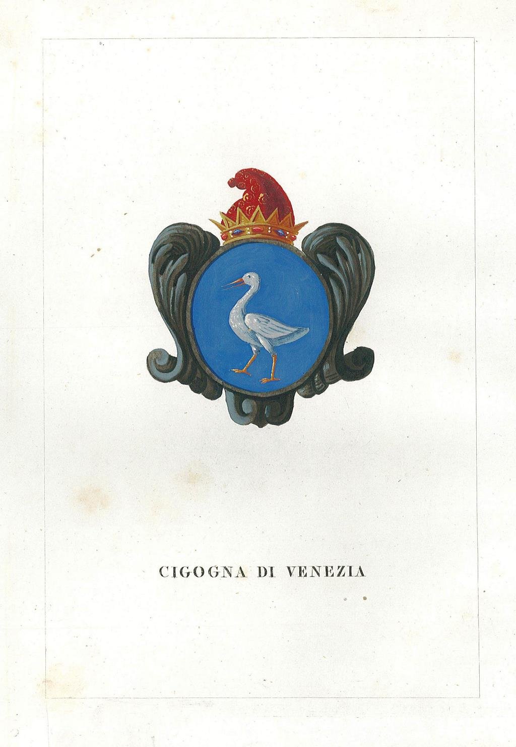 Stemma araldico della famiglia, finemente colorato a mano all'epoca con vivace acquerellatura a tempera. Inserita in una delle più importanti opere sull'araldica italiana in cui sono descritte ben 459 famiglie. L'opera è composta da bellissime incisioni di stemmi nobiliari in coloritura coeva e descrizioni genealogiche delle più importanti famiglie. Inserita in "Teatro araldico ovvero raccolta generale delle armi ed insegne gentilizie delle più illustri e nobili casate che sisterono un tempo e che tuttora fioriscono in tutta l'Italia. illustrate con relative genealogico-storiche nozioni da L. Tettoni e F. Saladini" Edita in Lodi e Milano pei tipi di Cl. Wilmant e figli dal 1841 al 1851. La stampa è accompagnata da pagina di testo storico descrittivo. Piccole macchie