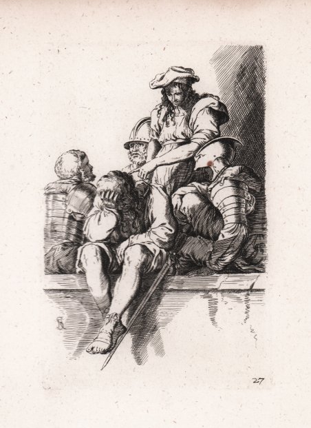 Acquaforte, circa 1675/80, priva di firma. Copia in controparte della stampa di Salvator Rosa, della serie dei capricci con soldati, detta le ' Figurine. ' La serie delle cosiddette ' Figurine ' di Salvator Rosa ebbe un grande successo, documentato dal gran numero di imitazioni che ebbe in tutta Europa. La prima edizione di questa raccolta fu realizzata dal Rosa in 62 tavole all’acquaforte incise tra il 1656 e il 1657. Almeno otto diverse copie della stessa edizione furono eseguite tra la fine del XVII e la prima metà del XVIII secolo. ' ' La serie venne inserita nella celebre ' Academia Todesca della Architectura, Scultura & Pittura: oder Teutsche Academie der Edlen Bau, Bild-und Mahlerey-Künste, raccolta monumentale, riccamente illustrata da centinaia di incisioni raffiguranti antichità, architettura e mitologia classica, edita a Norimberga e Francoforte tra il 1675 ed il 1680. ' Per le incisioni, il Sandrart si avvalse dei suoi collaboratori Karl Gustav von Amling (1650-1703); Philip Kilian (1628-1693); Richard Collin (1627-97); Georg Andreas Wolfgang (1631-1716); Johann Georg Waldreich (d.1680); Melchior Küsel (1626-1683); Franck, Johann (fl.1659-1690); George Christoph Eimmart (1638-1705); Susanna Maria von Sandrart (1658-1716); Bartholomäus Kilian (1630-1696). Bellissima prova, impressa su carta vergata coeva, con margini, in perfetto stato di conservazione. ' Bibliografia Cfr. Bartsch, Le ' Peintre graveur ' (XX.283.51); Wallace p. 330, 133; National Gallery (Washington), ' Mark J. Millard, III (1998), no. 111; F.W. H. Hollstein, ' German engravings . ca. 1400-1700 ' (1954-), 38-41; Anna Schreurs, ' Unter Minerva schutz: bildung durch kunst in Joachim von Sandrarts 'Teutscher Academie' ' (2012). Etching, ca. 1675/80, unsigned. Copy of Salvator Rosa's print from the Capricci with soldiers series, called the ' Figurine. The series of the so-called ' Figurine ' of Salvator Rosa had a great success, documented by the large number of imitations that had throughout Europe. The first edition of this collection was made by Rosa in 62 etching plates engraved between 1656 and 1657. At least eight different copies of the same edition were made between the end of the 17th and the first half of the 18th century. This set is part of the monumental ' Academia Todesca della Architectura, Scultura & Pittura: oder Teutsche Academie der Edlen Bau, Bild-und Mahlerey-Künste ' (Deutsche Academy of Architecture - Sculpture – Painting). ' The first edition, in German, was published by Joachim von Sandrart in Nuremberg, in three volumes respectively in 1675, 1679 and 1680. For the plates Sandrart used his students as and many others artist as ' Karl Gustav von Amling (1650-1703); Philip Kilian (1628-1693); Richard Collin (1627-97); Georg Andreas Wolfgang (1631-1716); Johann Georg Waldreich (d.1680); Melchior Küsel (1626-1683); Franck, Johann (fl.1659-1690); George Christoph Eimmart (1638-1705); Susanna Maria von Sandrart (1658-1716); Bartholomäus Kilian (1630-1696). The work is full of illustrations of ancient and modern Roman buildings, sculpture, the theory of painting, biographies of artists, including German and contemporary (ie seventeenth-century) artists, and antiquities. Joachim von Sandrart was a painter of some note but it is for his ' Teutsche Academie ' that he is chiefly remembered. His compendious treatise includes sections on ancient sculpture and architecture, perspective, the theory of painting, artists’ biographies, a translation of Ovid’s Metamorphoses and so on. The second part of Book I purports to give a history of art from its earliest origins, and opens with an engraving of two scenes of legendary accounts of the discovery of drawing. ' The work is dedicated to the world-renowned German nation and to champions and lovers of art ('Der Welt-berühmten Teutschen Nation . Kunst-Helden und Kunstliebenden'). Beautiful proof, printed on contemporary laid paper, with margins, in perfect condition. Bibliografia Cfr. Bartsch, Le ' Peintre graveur ' (XX.283.51); Wallace p. 330, 133; National Gallery (Washington), ' Mark J. Millard, III (1998), no. 111; F.W. H. Hollstein, ' German engravings . ca. 1400-1700 ' (1954-), 38-41; Anna Schreurs, ' Unter Minerva schutz: bildung durch kunst in Joachim von Sandrarts 'Teutscher Academie' ' (2012). Cfr.