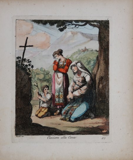 Costume popolare tratto dalla ' Nuova Raccolta di cinquanta motivi pittoreschi e costumi di Roma, 1810. Rara e bella serie, la seconda prodotta dall'artista, raffigurante costumi popolari singoli e in gruppo, scene e mestieri non solo di Roma e dintorni, ma anche di Campania, Calabria e Abruzzi. Stampatore, pittore, scultore e disegnatore italiano. Apprese i rudimenti della scultura dal padre, artigiano di piccole statuette religiose di scarso valore. Questo apprendistato in tenera età incoraggiò Pinelli ad enfatizzare la plasticità e l’espressione rispetto ai valori del Neo-Classicismo, predominanti a Roma. Purtroppo, sono pervenute fino a noi solo pochi esemplari delle sue sculture in terracotta, mentre conosciamo il volume di acqueforti, Gruppi pittoreschi (Roma, 1834), con rappresentazioni di popolani. L’enfasi sul naturalismo e su soggetti di vita quotidiana è di nuovo evidente. Sebbene avesse studiato presso l’Accademia di Belle Arti a Bologna, sostenuto economicamente dal Conte Lambertini, il nipote di Papa Benedetto XIV, Pinelli non aveva interesse a seguire l'iter tradizionale del successo artistico attraverso i soggetti religiosi. Di ritorno a Roma, alla fine del XVIII secolo, decise di vendere le sue opere nei caffè frequentati dai turisti. Incisione in rame, finemente colorata a mano, in ottimo stato di conservazione. Popular costume from ' Nuova Raccolta di cinquanta motivi pittoreschi e costumi di Roma, 1810. Rare and beautiful series, the second produced by the artist, depicting individual and group popular costumes, scenes and crafts not only of Rome and its surroundings, but also of Campania, Calabria and Abruzzi. Italian printmaker, painter, sculptor and draughtsman. He learnt the rudiments of sculpture from his father, a maker of cheap religious statuettes. This early training encouraged Pinelli to emphasize plasticity and expression over the Neo-classical values prevalent in Rome. Although only a few of his terracotta figures survive however, he did produce a volume of etchings, Gruppi pittoreschi (Rome, 1834), depicting rustic groups. Its emphasis on naturalism and everyday subject-matter is also characteristic of his sculptures. Although he studied both at the Accademia di San Luca in Rome and at the Accademia di Belle Arti in Bologna, helped financially by Conte Lambertini, Pope Benedict XIV’s nephew, Pinelli was not interested in pursuing the traditional path to artistic success via religious or history painting. On returning to Rome in the late 1790s he chose to peddle his works at the cafés frequented by tourists. Copperplate, finely hand coloured, in excellent condition. Cfr.