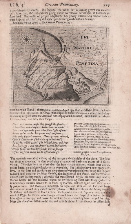 Una veduta a volo d'uccello delle Paludi Pontine, con il Monte Circeo. L'antica città arroccata in cima a una montagna sovrasta un gruppo di edifici sottostanti, contrassegnati dalla scritta "S. Felice". Felice". Incisa da Francis Delaram, l'illustrazione è tratta dall'opera in quattro volumi di George Sandy 'A Relation of a Journey begun An: Dom: 1610. Foure Bookes. Containing a description of the Turkish Empire, of AEgypt, of the Holy Land, of the Remote parts of Italy, and Ilands adioyning' stampata a Londra da W. Barrett, nel 1615. George Sandys (1578-1644) è stato un poeta e politico britannico. Dopo aver studiato a Oxford, divenne tesoriere coloniale per l'agricoltura e l'industria della Virginia Company. Durante la sua vita fu molto apprezzato come traduttore di poesia latina. Nel 1610 trascorse un anno in Turchia, Palestina ed Egitto. Le sue osservazioni lo fecero presto considerare un'autorità speciale sul Levante. La sua buona documentazione e la sua inclinazione letteraria segnano il passaggio dalla letteratura di viaggio del XVI secolo a quella del XVII. È anche rappresentativo di quelle narrazioni di viaggio che oscillano tra geografia, storia e diario di viaggio autobiografico di carattere fluido e contraddittorio. La sua pubblicazione diede un contributo essenziale alla conoscenza geografica ed etnografica del suo tempo. Fu tradotta in tedesco e in fiammingo, e solo nel XVII secolo ebbe nove edizioni. Francis Delaram (attivo dal 1615 al 1627) è stato un incisore inglese. Della vita di Delaram non si sa nulla, se non quello che si può dedurre dalle sue stampe. La maggior parte di esse sono ritratti o frontespizi, ma Delaram fu anche responsabile di alcuni primi libri di fiori, animali e uccelli, e probabilmente del primo libro di disegni inglese. A Londra lavorò per molti editori, tra cui Compton Holland, Sudbury & Humble, Roger Daniell e Maurice Blount. Non svolse mai personalmente l'attività di editore. Acquaforte e bulino, in ottimo stato di conservazione. A birds-eye-view of the Pontine Marshes, with the Circe Mount an area of historic marshland in the Lazio region of central Italy. The old city perched atop a mountain resides over a cluster of buildings below, labelled 'S. Felice'. Engraved by Francis Delaram is an illustration from George Sandy's four volume work 'A Relation of a Journey begun An: Dom: 1610. Foure Bookes. Containing a description of the Turkish Empire, of AEgypt, of the Holy Land, of the Remote parts of Italy, and Ilands adioyning' printed in London: W. Barrett, 1615. Francis Delaram (active 1615-1627) was a British engraver. Nothing is known of Delaram's life apart from what can be deduced from his prints. Most of them are portraits or title-pages, but Delaram was also responsible for some early books of flowers, beasts and birds, and probably the earliest English drawing book (of which no copy survives). While in London he worked for many publishers, including Compton Holland, Sudbury & Humble, Roger Daniell and Maurice Blount. He never acted as publisher himself. George Sandys (1578-1644) was a British poet and politician. After studying at Oxford he became colonial treasurer for agriculture and industry of the Virginia Company. In his lifetime he was much admired as a translator of Latin poetry. In 1610, he spent a year in Turkey, Palestine and Egypt. His observations soon saw him regarded as a special authority on the Levant. His good documentation and literary bent marks the transition from travel literature of the sixteenth century to that of the seventeenth. It is also representative of those travel narratives that oscillate between geography, history and autobiographical travelogue of fluid and contradictory character. His publication made an essential contribution to the geographical and ethnographical knowledge of its time. It was translated into German and Flemish, and ran through nine editions in the seventeenth century alone. Cfr.