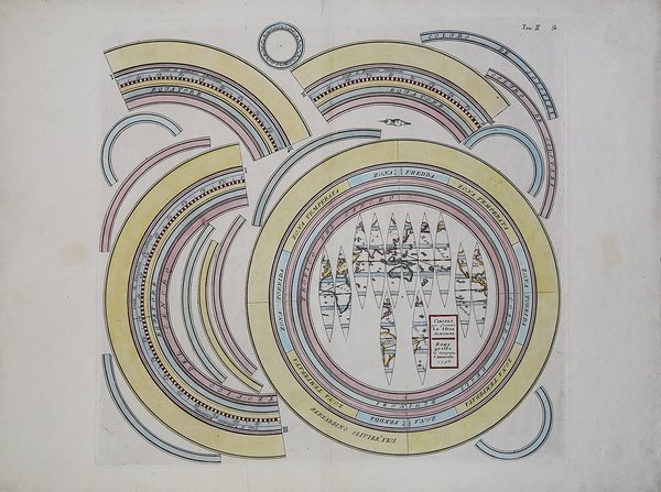 Foglio contenente ' delle sezioni di globo - in dodici segmenti - e altri elementi atti a costruire una sfera armillare. Il globo terrestre centrale è in 12 segmenti e avrebbe un diametro di circa 5,5 cm se costruito. La sfera armillare complessiva avrebbe un diametro di 28 cm. I vari anelli della sfera armillare comprendono l'equatore, il Tropico del Cancro, il Tropico del Capricorno, le zone e i cerchi polari e antartici. ' Tavola edita dalla Calcografia Camerale, Roma 1795 e ' tratta dal Nuovo Atlante Geografico Universale delineato sulle ultime osservazioni, edito a Roma dal 1792 fino al 1801, opera che la Calcografia Camerale commissionò al Cassini al fine di sostituire l’ormai obsoleto Mercurio Geografico della tipografia De Rossi. ' Bernardino Olivieri fu cartografo incisore presso la Calcografia Camerale di Roma sitauta nel Collegio di Propaganda Fide Incisione in rame, finemente colorata a mano, in ottime condizioni. Rara. This matching set of sheets contain the pieces to construct an armillary sphere. The central terrestrial globe is in 12 segments and would have a diameter of approximately 5.5 cm if constructed. The overall armillary sphere would have a diameter of 28 cm. The various rings of the armillary sphere include the equator, the Tropic of Cancer, the Tropic of Capricorn, the zones, and the Polar and Antarctic circles. Uncommon maps, published in the ' Nuovo Atlante Geografico Universale, that was commissioned to Cassini by the Calcografia Camerale, in order to replace the obsolete De Rossi's ' ' Mercurio Geografico. Bernardino Olivieri was a cartographer and engraver at the Calcografia Camerale di Roma located in the Collegio di Propaganda Fide. Copper engraving, finely hand colored, in very good condition. Rare. Cfr.