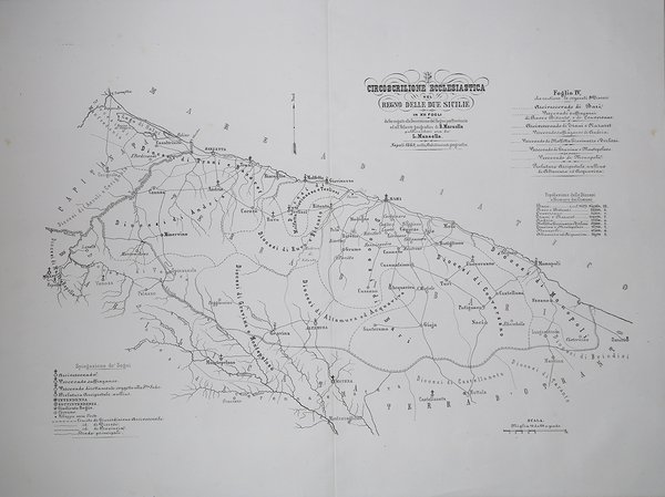 Progettata dal Marzolla in 12 fogli ed annunciata nel 1857, la carta delle "Circoscrizione Ecclesiastica del Regno delle Due Sicilie" l'opera venne pubblicata solo postuma, a causa della morte dell'autore, nel maggio del 1858. Tra il 1859 ed il 1860 una decina di fogli vennero alla luce per cura dell'architetto Luigi Manzella, che seguì il Marzolla alla direzione dello Stabilimento Geografico. La fine dell'impero Borbonico, nel maggio del 1860, e lo smantellamento dello Stabilimento Geografico (1880 circa), impedì successive ristampe di queste carte, che sono pertanto rarissime. Litografia, in eccellente stato di conservazione. Bibliografia: Valerio, Benedetto Marzolla Brindisino, Geografo e Cartografo dell'800 Europeo, pag. 63, 159. Progettata dal Marzolla in 12 fogli ed annunciata nel 1857, la carta delle "Circoscrizione Ecclesiastica del Regno delle Due Sicilie" l'opera venne pubblicata solo postuma, a causa della morte dell'autore, nel maggio del 1858. Tra il 1859 ed il 1860 una decina di fogli vennero alla luce per cura dell'architetto Luigi Manzella, che seguì il Marzolla alla direzione dello Stabilimento Geografico. La fine dell'impero Borbonico, nel maggio del 1860, e lo smantellamento dello Stabilimento Geografico (1880 circa), impedì successive ristampe di queste carte, che sono pertanto rarissime. Litografia, in eccellente stato di conservazione. Bibliografia: Valerio, Benedetto Marzolla Brindisino, Geografo e Cartografo dell'800 Europeo, pag. 63, 159. Cfr.