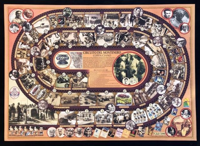 By L. Ciompi - D. Anichini, 2017. Grande gioco dell'oca a 63 caselle che ripercorre l'importante evento sportivo del Montenero Circuit che ebbe luogo a Livorno dal 1921 al 1939, cm 48 x 68, stampato su buona carta rigata. Questo gioco fu per la prima volta stampato nel 2001 in occasione della Mostra "Tazio a Quercianella, Nuovolari a Livorno, 2001". Viene quindi ristampato in occasione del centenario della Coppa Montenero 1921 - 2021, reimpostato nel 2017 rispetto alla prima versione inglese e nel 2021 realizzato in numero di 500 copie numerate e firmate a mano da Luigi Ciompi. Ottimo stato di conservazione. .