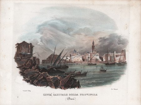 Veduta tratta dall’Atlante Corografico, Statistico, Storico, ed Idrografico del Regno delle Due Sicilie Diviso ne Domini al di qua ed al di la del Faro ' di Giuseppe Bifezzi, stampato a Napoli, Tipografia alla Sibilla, 1836-1845. L'opera uscì a Napoli tra il 1836 e il 1845 in 15 dispense, ciascuna composta di testo e tavole ed è assai rara. Il progetto prevedeva anche una seconda parte riguardante la Sicilia che non fu mai realizzata. Le 15 dispense, ciascuna con frontespizio proprio, riguardano: I. ' Provincia di Napoli, 1843. II. ' Provincia di Terra di lavoro, 1841. III. ' Provincia di Principato citeriore, 1841. IV. ' Basilicata,1843. V. ' Principato ulteriore,1836. VI. ' Capitanata, 1842. VII. ' Terra di Bari, 1839. VIII. ' Terra di Otranto, 1841. IX. ' Calabria citeriore, 1836. X. ' Calabria ulteriore II, 1839. XI. ' Calabria ulteriore I, 1839. XII. ' Contado di Molise, 1842. XIII. ' Abruzzo citeriore, 1837. XIV. ' Abruzzo ultra secondo, ' 1838. XV. ' Abruzzo ulteriore primo, 1841. Il volume è illustrato da una carta geografica generale del Regno di Napoli, 2 tavole con raffigurati i laghi principali del Regno, 15 carte geografiche con i confini acquerellati, corrispondenti alle 15 province, 16 vedute: Napoli, Caserta, Capua, Salerno, Potenza, Avellino, Foggia, Bari, Lecce, Cosenza, Catanzaro, Reggio Calabria, Campobasso, Chieti, Aquila, Teramo e 16 tavole di costumi delle diverse province. Le vedute e i costumi sono litografie di Giuseppe D’Onofrio da disegni di Francesco Wenzel. Franz Wenzel, meglio conosciuto con il nome italianizzato di Francesco, è un litografo attivo a Napoli tra il 1827 e il 1850 con sede a Largo S. Caterina a Chiaja n.74 e 75. Wenzel appartiene al gruppo di artisti tedeschi a Napoli dalla prima metà dell'800, dove si generalizza l'uso della tecnica di stampa di importazione tedesca, la litografia. Nel 1816 Müller e Patrelli introducono nel Regno la più economica e rapida litografia e nel 1823 nasce la Litografia Militare. Dopo gli esordi introduttivi, crescono stabilimenti litografici già attivi negli anni '25-'30 (Cuciniello/Bianchi, Richter, Wenzel, Zezon), impiantandosi nella seconda metà del secolo varie imprese tipo-litografiche (Nobile, Giannini, Morano). Litografia con bellissima coloritura a mano, in ottimo stato di conservazione. View taken from the ' Atlante Corografico, Statistico, Storico, ed Idrografico del Regno delle Due Sicilie Diviso ne Domini al di qua ed al di la del Faro ' by Giuseppe Bifezzi, printed in Naples, Tipografia alla Sibilla, 1836-1845. This is the definitive edition of Calabrian geographer Giuseppe Bifezzi's important survey of the peninsular part of the Kingdom of Naples. The work came out in Naples between 1836 and 1845 in 15 parts, each consisting of text and plates, and is very rare. The project also included a second part concerning Sicily, which was never realized. The volume is illustrated by a general map of the Kingdom of Naples, 2 plates depicting the main lakes of the Kingdom, 15 maps with watercolor borders, corresponding to the 15 provinces, 16 views: Naples, Caserta, Capua, Salerno, Potenza, Avellino, Foggia, Bari, Lecce, Cosenza, Catanzaro, Reggio Calabria, Campobasso, Chieti, Aquila, Teramo, and 16 plates of costumes of the different provinces. The views and costumes are lithographs by Giuseppe D'Onofrio from drawings by Francesco Wenzel. Franz Wenzel, better known by his Italianized name of Francesco, was a lithographer active in Naples between 1827 and 1850 based at Largo S. Caterina a Chiaja n.74 and 75. Wenzel belongs to the group of German artists in Naples from the first half of the 19th century, where the use of the German imported printing technique, lithography, became generalized. In 1816 Müller and Patrelli introduced the cheaper and faster lithography to the Kingdom, and in 1823 Military Lithography was born. After the introductory beginnings, lithographic establishments already active in the 1825s-30s grew (Cuciniello/Bianchi, Richter, Wenzel, Zezon), implanting in the second half of the century various lithographic-type enterprises (Nobile, Giannini, Morano). Litograph, with fine later hand colour, very good condition. Cfr.