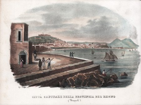 Veduta tratta dall’Atlante Corografico, Statistico, Storico, ed Idrografico del Regno delle Due Sicilie Diviso ne Domini al di qua ed al di la del Faro ' di Giuseppe Bifezzi, stampato a Napoli, Tipografia alla Sibilla, 1836-1845. L'opera uscì a Napoli tra il 1836 e il 1845 in 15 dispense, ciascuna composta di testo e tavole ed è assai rara. Il progetto prevedeva anche una seconda parte riguardante la Sicilia che non fu mai realizzata. Le 15 dispense, ciascuna con frontespizio proprio, riguardano: I. ' Provincia di Napoli, 1843. II. ' Provincia di Terra di lavoro, 1841. III. ' Provincia di Principato citeriore, 1841. IV. ' Basilicata,1843. V. ' Principato ulteriore,1836. VI. ' Capitanata, 1842. VII. ' Terra di Bari, 1839. VIII. ' Terra di Otranto, 1841. IX. ' Calabria citeriore, 1836. X. ' Calabria ulteriore II, 1839. XI. ' Calabria ulteriore I, 1839. XII. ' Contado di Molise, 1842. XIII. ' Abruzzo citeriore, 1837. XIV. ' Abruzzo ultra secondo, ' 1838. XV. ' Abruzzo ulteriore primo, 1841. Il volume è illustrato da una carta geografica generale del Regno di Napoli, 2 tavole con raffigurati i laghi principali del Regno, 15 carte geografiche con i confini acquerellati, corrispondenti alle 15 province, 16 vedute: Napoli, Caserta, Capua, Salerno, Potenza, Avellino, Foggia, Bari, Lecce, Cosenza, Catanzaro, Reggio Calabria, Campobasso, Chieti, Aquila, Teramo e 16 tavole di costumi delle diverse province. Le vedute e i costumi sono litografie di Giuseppe D’Onofrio da disegni di Francesco Wenzel. Franz Wenzel, meglio conosciuto con il nome italianizzato di Francesco, è un litografo attivo a Napoli tra il 1827 e il 1850 con sede a Largo S. Caterina a Chiaja n.74 e 75. Wenzel appartiene al gruppo di artisti tedeschi a Napoli dalla prima metà dell'800, dove si generalizza l'uso della tecnica di stampa di importazione tedesca, la litografia. Nel 1816 Müller e Patrelli introducono nel Regno la più economica e rapida litografia e nel 1823 nasce la Litografia Militare. Dopo gli esordi introduttivi, crescono stabilimenti litografici già attivi negli anni '25-'30 (Cuciniello/Bianchi, Richter, Wenzel, Zezon), impiantandosi nella seconda metà del secolo varie imprese tipo-litografiche (Nobile, Giannini, Morano). Litografia con bellissima coloritura a mano, in ottimo stato di conservazione. View taken from the ' Atlante Corografico, Statistico, Storico, ed Idrografico del Regno delle Due Sicilie Diviso ne Domini al di qua ed al di la del Faro ' by Giuseppe Bifezzi, printed in Naples, Tipografia alla Sibilla, 1836-1845. This is the definitive edition of Calabrian geographer Giuseppe Bifezzi's important survey of the peninsular part of the Kingdom of Naples. The work came out in Naples between 1836 and 1845 in 15 parts, each consisting of text and plates, and is very rare. The project also included a second part concerning Sicily, which was never realized. The volume is illustrated by a general map of the Kingdom of Naples, 2 plates depicting the main lakes of the Kingdom, 15 maps with watercolor borders, corresponding to the 15 provinces, 16 views: Naples, Caserta, Capua, Salerno, Potenza, Avellino, Foggia, Bari, Lecce, Cosenza, Catanzaro, Reggio Calabria, Campobasso, Chieti, Aquila, Teramo, and 16 plates of costumes of the different provinces. The views and costumes are lithographs by Giuseppe D'Onofrio from drawings by Francesco Wenzel. Franz Wenzel, better known by his Italianized name of Francesco, was a lithographer active in Naples between 1827 and 1850 based at Largo S. Caterina a Chiaja n.74 and 75. Wenzel belongs to the group of German artists in Naples from the first half of the 19th century, where the use of the German imported printing technique, lithography, became generalized. In 1816 Müller and Patrelli introduced the cheaper and faster lithography to the Kingdom, and in 1823 Military Lithography was born. After the introductory beginnings, lithographic establishments already active in the 1825s-30s grew (Cuciniello/Bianchi, Richter, Wenzel, Zezon), implanting in the second half of the century various lithographic-type enterprises (Nobile, Giannini, Morano). Litograph, with fine later hand colour, very good condition. Cfr.
