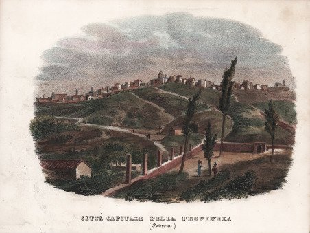 Veduta tratta dall’Atlante Corografico, Statistico, Storico, ed Idrografico del Regno delle Due Sicilie Diviso ne Domini al di qua ed al di la del Faro ' di Giuseppe Bifezzi, stampato a Napoli, Tipografia alla Sibilla, 1836-1845. L'opera uscì a Napoli tra il 1836 e il 1845 in 15 dispense, ciascuna composta di testo e tavole ed è assai rara. Il progetto prevedeva anche una seconda parte riguardante la Sicilia che non fu mai realizzata. Le 15 dispense, ciascuna con frontespizio proprio, riguardano: I. ' Provincia di Napoli, 1843. II. ' Provincia di Terra di lavoro, 1841. III. ' Provincia di Principato citeriore, 1841. IV. ' Basilicata,1843. V. ' Principato ulteriore,1836. VI. ' Capitanata, 1842. VII. ' Terra di Bari, 1839. VIII. ' Terra di Otranto, 1841. IX. ' Calabria citeriore, 1836. X. ' Calabria ulteriore II, 1839. XI. ' Calabria ulteriore I, 1839. XII. ' Contado di Molise, 1842. XIII. ' Abruzzo citeriore, 1837. XIV. ' Abruzzo ultra secondo, ' 1838. XV. ' Abruzzo ulteriore primo, 1841. Il volume è illustrato da una carta geografica generale del Regno di Napoli, 2 tavole con raffigurati i laghi principali del Regno, 15 carte geografiche con i confini acquerellati, corrispondenti alle 15 province, 16 vedute: Napoli, Caserta, Capua, Salerno, Potenza, Avellino, Foggia, Bari, Lecce, Cosenza, Catanzaro, Reggio Calabria, Campobasso, Chieti, Aquila, Teramo e 16 tavole di costumi delle diverse province. Le vedute e i costumi sono litografie di Giuseppe D’Onofrio da disegni di Francesco Wenzel. Franz Wenzel, meglio conosciuto con il nome italianizzato di Francesco, è un litografo attivo a Napoli tra il 1827 e il 1850 con sede a Largo S. Caterina a Chiaja n.74 e 75. Wenzel appartiene al gruppo di artisti tedeschi a Napoli dalla prima metà dell'800, dove si generalizza l'uso della tecnica di stampa di importazione tedesca, la litografia. Nel 1816 Müller e Patrelli introducono nel Regno la più economica e rapida litografia e nel 1823 nasce la Litografia Militare. Dopo gli esordi introduttivi, crescono stabilimenti litografici già attivi negli anni '25-'30 (Cuciniello/Bianchi, Richter, Wenzel, Zezon), impiantandosi nella seconda metà del secolo varie imprese tipo-litografiche (Nobile, Giannini, Morano). Litografia con bellissima coloritura a mano, in ottimo stato di conservazione. View taken from the ' Atlante Corografico, Statistico, Storico, ed Idrografico del Regno delle Due Sicilie Diviso ne Domini al di qua ed al di la del Faro ' by Giuseppe Bifezzi, printed in Naples, Tipografia alla Sibilla, 1836-1845. This is the definitive edition of Calabrian geographer Giuseppe Bifezzi's important survey of the peninsular part of the Kingdom of Naples. The work came out in Naples between 1836 and 1845 in 15 parts, each consisting of text and plates, and is very rare. The project also included a second part concerning Sicily, which was never realized. The volume is illustrated by a general map of the Kingdom of Naples, 2 plates depicting the main lakes of the Kingdom, 15 maps with watercolor borders, corresponding to the 15 provinces, 16 views: Naples, Caserta, Capua, Salerno, Potenza, Avellino, Foggia, Bari, Lecce, Cosenza, Catanzaro, Reggio Calabria, Campobasso, Chieti, Aquila, Teramo, and 16 plates of costumes of the different provinces. The views and costumes are lithographs by Giuseppe D'Onofrio from drawings by Francesco Wenzel. Franz Wenzel, better known by his Italianized name of Francesco, was a lithographer active in Naples between 1827 and 1850 based at Largo S. Caterina a Chiaja n.74 and 75. Wenzel belongs to the group of German artists in Naples from the first half of the 19th century, where the use of the German imported printing technique, lithography, became generalized. In 1816 Müller and Patrelli introduced the cheaper and faster lithography to the Kingdom, and in 1823 Military Lithography was born. After the introductory beginnings, lithographic establishments already active in the 1825s-30s grew (Cuciniello/Bianchi, Richter, Wenzel, Zezon), implanting in the second half of the century various lithographic-type enterprises (Nobile, Giannini, Morano). Litograph, with fine later hand colour, very good condition. Cfr.