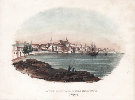 Veduta tratta dallâAtlante Corografico, Statistico, Storico, ed Idrografico del Regno delle Due Sicilie Diviso ne Domini al di qua ed al di la del Faro di Giuseppe Bifezzi, stampato a Napoli, Tipografia alla Sibilla, 1836-1845. L'opera uscì a Napoli tra il 1836 e il 1845 in 15 dispense, ciascuna composta di testo e tavole ed è assai rara. Il progetto prevedeva anche una seconda parte riguardante la Sicilia che non fu mai realizzata. Le 15 dispense, ciascuna con frontespizio proprio, riguardano: I. Provincia di Napoli, 1843. II. Provincia di Terra di lavoro, 1841. III. Provincia di Principato citeriore, 1841. IV. Basilicata,1843. V. Principato ulteriore,1836. VI. Capitanata, 1842. VII. Terra di Bari, 1839. VIII. Terra di Otranto, 1841. IX. Calabria citeriore, 1836. X. Calabria ulteriore II, 1839. XI. Calabria ulteriore I, 1839. XII. Contado di Molise, 1842. XIII. Abruzzo citeriore, 1837. XIV. Abruzzo ultra secondo, 1838. XV. Abruzzo ulteriore primo, 1841. Il volume è illustrato da una carta geografica generale del Regno di Napoli, 2 tavole con raffigurati i laghi principali del Regno, 15 carte geografiche con i confini acquerellati, corrispondenti alle 15 province, 16 vedute: Napoli, Caserta, Capua, Salerno, Potenza, Avellino, Foggia, Bari, Lecce, Cosenza, Catanzaro, Reggio Calabria, Campobasso, Chieti, Aquila, Teramo e 16 tavole di costumi delle diverse province. Le vedute e i costumi sono litografie di Giuseppe DâOnofrio da disegni di Francesco Wenzel. Franz Wenzel, meglio conosciuto con il nome italianizzato di Francesco, è un litografo attivo a Napoli tra il 1827 e il 1850 con sede a Largo S. Caterina a Chiaja n.74 e 75. Wenzel appartiene al gruppo di artisti tedeschi a Napoli dalla prima metà dell'800, dove si generalizza l'uso della tecnica di stampa di importazione tedesca, la litografia. Nel 1816 Müller e Patrelli introducono nel Regno la più economica e rapida litografia e nel 1823 nasce la Litografia Militare. Dopo gli esordi introduttivi, crescono stabilimenti litografici già attivi negli anni '25-'30 (Cuciniello/Bianchi, Richter, Wenzel, Zezon), impiantandosi nella seconda metà del secolo varie imprese tipo-litografiche (Nobile, Giannini, Morano). Litografia con bellissima coloritura a mano, in ottimo stato di conservazione.