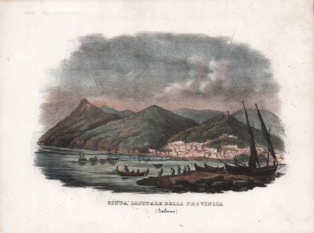 Veduta tratta dall’Atlante Corografico, Statistico, Storico, ed Idrografico del Regno delle Due Sicilie Diviso ne Domini al di qua ed al di la del Faro ' di Giuseppe Bifezzi, stampato a Napoli, Tipografia alla Sibilla, 1836-1845. L'opera uscì a Napoli tra il 1836 e il 1845 in 15 dispense, ciascuna composta di testo e tavole ed è assai rara. Il progetto prevedeva anche una seconda parte riguardante la Sicilia che non fu mai realizzata. Le 15 dispense, ciascuna con frontespizio proprio, riguardano: I. ' Provincia di Napoli, 1843. II. ' Provincia di Terra di lavoro, 1841. III. ' Provincia di Principato citeriore, 1841. IV. ' Basilicata,1843. V. ' Principato ulteriore,1836. VI. ' Capitanata, 1842. VII. ' Terra di Bari, 1839. VIII. ' Terra di Otranto, 1841. IX. ' Calabria citeriore, 1836. X. ' Calabria ulteriore II, 1839. XI. ' Calabria ulteriore I, 1839. XII. ' Contado di Molise, 1842. XIII. ' Abruzzo citeriore, 1837. XIV. ' Abruzzo ultra secondo, ' 1838. XV. ' Abruzzo ulteriore primo, 1841. Il volume è illustrato da una carta geografica generale del Regno di Napoli, 2 tavole con raffigurati i laghi principali del Regno, 15 carte geografiche con i confini acquerellati, corrispondenti alle 15 province, 16 vedute: Napoli, Caserta, Capua, Salerno, Potenza, Avellino, Foggia, Bari, Lecce, Cosenza, Catanzaro, Reggio Calabria, Campobasso, Chieti, Aquila, Teramo e 16 tavole di costumi delle diverse province. Le vedute e i costumi sono litografie di Giuseppe D’Onofrio da disegni di Francesco Wenzel. Franz Wenzel, meglio conosciuto con il nome italianizzato di Francesco, è un litografo attivo a Napoli tra il 1827 e il 1850 con sede a Largo S. Caterina a Chiaja n.74 e 75. Wenzel appartiene al gruppo di artisti tedeschi a Napoli dalla prima metà dell'800, dove si generalizza l'uso della tecnica di stampa di importazione tedesca, la litografia. Nel 1816 Müller e Patrelli introducono nel Regno la più economica e rapida litografia e nel 1823 nasce la Litografia Militare. Dopo gli esordi introduttivi, crescono stabilimenti litografici già attivi negli anni '25-'30 (Cuciniello/Bianchi, Richter, Wenzel, Zezon), impiantandosi nella seconda metà del secolo varie imprese tipo-litografiche (Nobile, Giannini, Morano). Litografia con bellissima coloritura a mano, in ottimo stato di conservazione. View taken from the ' Atlante Corografico, Statistico, Storico, ed Idrografico del Regno delle Due Sicilie Diviso ne Domini al di qua ed al di la del Faro ' by Giuseppe Bifezzi, printed in Naples, Tipografia alla Sibilla, 1836-1845. This is the definitive edition of Calabrian geographer Giuseppe Bifezzi's important survey of the peninsular part of the Kingdom of Naples. The work came out in Naples between 1836 and 1845 in 15 parts, each consisting of text and plates, and is very rare. The project also included a second part concerning Sicily, which was never realized. The volume is illustrated by a general map of the Kingdom of Naples, 2 plates depicting the main lakes of the Kingdom, 15 maps with watercolor borders, corresponding to the 15 provinces, 16 views: Naples, Caserta, Capua, Salerno, Potenza, Avellino, Foggia, Bari, Lecce, Cosenza, Catanzaro, Reggio Calabria, Campobasso, Chieti, Aquila, Teramo, and 16 plates of costumes of the different provinces. The views and costumes are lithographs by Giuseppe D'Onofrio from drawings by Francesco Wenzel. Franz Wenzel, better known by his Italianized name of Francesco, was a lithographer active in Naples between 1827 and 1850 based at Largo S. Caterina a Chiaja n.74 and 75. Wenzel belongs to the group of German artists in Naples from the first half of the 19th century, where the use of the German imported printing technique, lithography, became generalized. In 1816 Müller and Patrelli introduced the cheaper and faster lithography to the Kingdom, and in 1823 Military Lithography was born. After the introductory beginnings, lithographic establishments already active in the 1825s-30s grew (Cuciniello/Bianchi, Richter, Wenzel, Zezon), implanting in the second half of the century various lithographic-type enterprises (Nobile, Giannini, Morano). Litograph, with fine later hand colour, very good condition. Cfr.