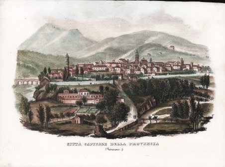 Veduta tratta dall’Atlante Corografico, Statistico, Storico, ed Idrografico del Regno delle Due Sicilie Diviso ne Domini al di qua ed al di la del Faro ' di Giuseppe Bifezzi, stampato a Napoli, Tipografia alla Sibilla, 1836-1845. L'opera uscì a Napoli tra il 1836 e il 1845 in 15 dispense, ciascuna composta di testo e tavole ed è assai rara. Il progetto prevedeva anche una seconda parte riguardante la Sicilia che non fu mai realizzata. Le 15 dispense, ciascuna con frontespizio proprio, riguardano: I. ' Provincia di Napoli, 1843. II. ' Provincia di Terra di lavoro, 1841. III. ' Provincia di Principato citeriore, 1841. IV. ' Basilicata,1843. V. ' Principato ulteriore,1836. VI. ' Capitanata, 1842. VII. ' Terra di Bari, 1839. VIII. ' Terra di Otranto, 1841. IX. ' Calabria citeriore, 1836. X. ' Calabria ulteriore II, 1839. XI. ' Calabria ulteriore I, 1839. XII. ' Contado di Molise, 1842. XIII. ' Abruzzo citeriore, 1837. XIV. ' Abruzzo ultra secondo, ' 1838. XV. ' Abruzzo ulteriore primo, 1841. Il volume è illustrato da una carta geografica generale del Regno di Napoli, 2 tavole con raffigurati i laghi principali del Regno, 15 carte geografiche con i confini acquerellati, corrispondenti alle 15 province, 16 vedute: Napoli, Caserta, Capua, Salerno, Potenza, Avellino, Foggia, Bari, Lecce, Cosenza, Catanzaro, Reggio Calabria, Campobasso, Chieti, Aquila, Teramo e 16 tavole di costumi delle diverse province. Le vedute e i costumi sono litografie di Giuseppe D’Onofrio da disegni di Francesco Wenzel. Franz Wenzel, meglio conosciuto con il nome italianizzato di Francesco, è un litografo attivo a Napoli tra il 1827 e il 1850 con sede a Largo S. Caterina a Chiaja n.74 e 75. Wenzel appartiene al gruppo di artisti tedeschi a Napoli dalla prima metà dell'800, dove si generalizza l'uso della tecnica di stampa di importazione tedesca, la litografia. Nel 1816 Müller e Patrelli introducono nel Regno la più economica e rapida litografia e nel 1823 nasce la Litografia Militare. Dopo gli esordi introduttivi, crescono stabilimenti litografici già attivi negli anni '25-'30 (Cuciniello/Bianchi, Richter, Wenzel, Zezon), impiantandosi nella seconda metà del secolo varie imprese tipo-litografiche (Nobile, Giannini, Morano). Litografia con bellissima coloritura a mano, in ottimo stato di conservazione. View taken from the ' Atlante Corografico, Statistico, Storico, ed Idrografico del Regno delle Due Sicilie Diviso ne Domini al di qua ed al di la del Faro ' by Giuseppe Bifezzi, printed in Naples, Tipografia alla Sibilla, 1836-1845. This is the definitive edition of Calabrian geographer Giuseppe Bifezzi's important survey of the peninsular part of the Kingdom of Naples. The work came out in Naples between 1836 and 1845 in 15 parts, each consisting of text and plates, and is very rare. The project also included a second part concerning Sicily, which was never realized. The volume is illustrated by a general map of the Kingdom of Naples, 2 plates depicting the main lakes of the Kingdom, 15 maps with watercolor borders, corresponding to the 15 provinces, 16 views: Naples, Caserta, Capua, Salerno, Potenza, Avellino, Foggia, Bari, Lecce, Cosenza, Catanzaro, Reggio Calabria, Campobasso, Chieti, Aquila, Teramo, and 16 plates of costumes of the different provinces. The views and costumes are lithographs by Giuseppe D'Onofrio from drawings by Francesco Wenzel. Franz Wenzel, better known by his Italianized name of Francesco, was a lithographer active in Naples between 1827 and 1850 based at Largo S. Caterina a Chiaja n.74 and 75. Wenzel belongs to the group of German artists in Naples from the first half of the 19th century, where the use of the German imported printing technique, lithography, became generalized. In 1816 Müller and Patrelli introduced the cheaper and faster lithography to the Kingdom, and in 1823 Military Lithography was born. After the introductory beginnings, lithographic establishments already active in the 1825s-30s grew (Cuciniello/Bianchi, Richter, Wenzel, Zezon), implanting in the second half of the century various lithographic-type enterprises (Nobile, Giannini, Morano). Litograph, with fine later hand colour, very good condition. Cfr.