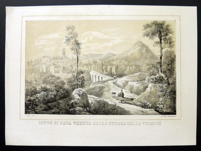 Litografia Poliorama, Napoli, 1850 circa. Tonolitografia, cm 23 x 31 circa (il foglio), disegno di S. Leale. Veduta della città di Cava, presso Napoli. Buono stato.