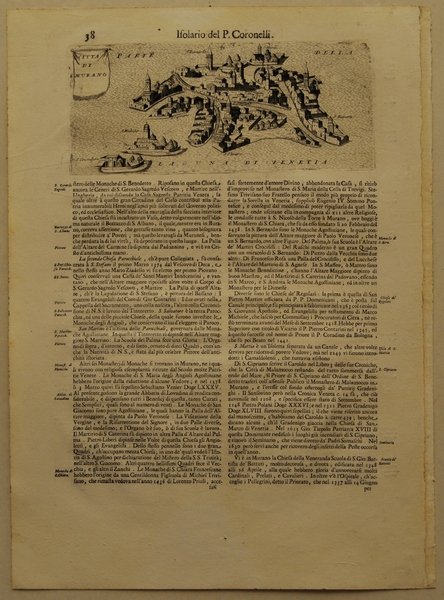 Incisione con veduta di mm 253 x 110 su foglio di mm 354 x 483 proveniente dal "Isolario, descrittione geografico-historica, sacro-profana, antico-moderna, politica, naturale, e poetica. Mari, golfi, seni, piagge, porti, barche, pesche, promontorj, monti, boschi, fiumi . ed ogni piu esatta notitia di tutte l'isole coll'osservationi degli scogli sirti, scagni, e secche del globo terracqueo. Aggiuntivi anche i ritratti de' dominatori di esse. Ornato di trecento-dieci tavole geografiche, topografiche, corografiche, iconografiche, scenografiche . a' maggiore dilucidatione, ed uso della navigatione, et in supplimento dei 14 volumi del Bleau. Tomo II. dell'Atlante veneto. Opera, e studio del p. maestro Vincenzo Coronelli .". (P. 38). E. Armao, Vincenzo Coronelli p.116-124; E.A. Cicogna, Saggio di bibliografia veneziana p.617-618 n.4588; NUC pre-1956 v.123 p.316; Un intellettuale europeo e il suo universo . a cura di M.G. Tavoni p.219