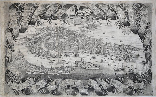 Grande e decorativa pianta prospettica della città di Venezia.A sinistra troviamo il titolo: Città di Venetia descritta dal P. Coronelli Cosmografo della Serenissima Republica. In alto a destra: Dedicata All'Illustrissimo Signo Abbate Abbondio Rezzonico Patrizio Veneto 1693. "La pianta, decorata da un cartiglio a nastro attorcigliato che la incornicia e in cui sono raffigurati gli stemmi delle città della Repubblica veneta, è ripresa dalla pianta prospettica del Merian del 1635, aggiornata con l'aggiunta della basilica della Salute. Disegnata da anonimo (l'attribuzione del disegno al Coronelli è da ritenersi incerta) venne pubblicata dal P. V. Coronelli nel suo Corso Geografico Universale ed in seguito compreso nell'Isolario" (cfr. Romanelli-Biadene, p. 56). Il secondo stato di questa pianta non comprende la dedica all'abate Rezzonico.Acquaforte e bulino, stampata su carta vergata coeva, rifilata al rame o con piccoli margini. Opera tratta dallâIsolario dellâAtlante Veneto del P. Coronelli, In Venetia MDCXCVI. Coronelli visse un periodo di straordinaria fecondità editoriale a partire dal 1689, quando ebbe la cattedra di geografia presso l'Università alle Procuratie, con la pubblicazione, nel 1690, del primo volume dell'Atlante Veneto. In effetti sotto il nome di Atlante Veneto va tutta la raccolta di tredici opere composte nell'arco del decennio successivo, dall'Isolario allo Specchio del mare. L'Isolario mira, con una barocca e minuziosa ricerca del dettaglio, alla celebrazione dei possedimenti della Serenissima. Monumentale raccolta di carte e vedute di isole, rappresenta l'ultimo degli âisolariâ concepiti, che, tra la fine del XVII e l'inizio del XVIII secolo, vennero progressivamente soppiantati dagli atlanti di moderna concezione, opere a stampa caratterizzate da crescente precisione scientifica e da sempre minore pregio artistico. Sulla scia delle nuove conquiste coloniali le rappresentazioni cartografiche vennero ad assumere un carattere sempre più tecnico, fino ad allora piuttosto arbitrario. La pianta era telata - supporto rimosso. Al verso sono presenti numerose abrasioni con parziale perdita del testo descrittivo; inoltre sono visibili tracce di colla. Altri restauri perfettamente eseguiti al recto, nel complesso in buono stato di conservazione. Esemplare decorativo, non in qualità collezzionistìca, tuttavia dal grande sapore e fascino. "Comunemente considerata una tra le più belle, è certamente la più conosciuta e apprezzata pianta di Venezia" (cfr. Moretto, n. 114).