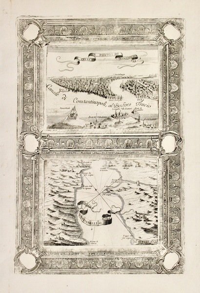 Incisione in rame, mm 400x260. Non comune veduta della città entro ampia bordura decorativa. Nel riquadro inferiore una veduta dei Dardanelli. Ampi margini. Perfetto esemplare. <BR>