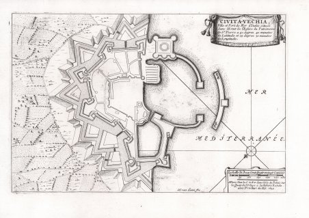 Pianta delle fortificazioni di Civitavecchia tratta dal ' Les forces de l’Europe ou description des principals villes…Paris: Chez l'Auteur, 1693-1696. ' Noto atlante militare francese, anche se, prevalentemente, si tratta di mappe, piani e vedute di fortificazioni di città europee in Francia, Germania e Paesi Bassi, l'atlante include anche una serie di altre regioni, tra cui Malta, Costantinopoli, Tripoli e altrove. Nicholas de Fer (1646-1720) era figlio di un venditore di mappe, Antoine de Fer, e divenne uno dei cartografi più noti della Francia del XVII secolo. A dodici anni fu apprendista presso l'incisore Louis Spirinx. Quando il padre morì nel 1673, Nicholas aiutò la madre a gestire l'attività fino al 1687, quando divenne l'unico proprietario. Nel 1697 pubblicò il suo primo atlante mondiale. Dopo la sua morte, avvenuta nel 1720, l'attività passò ai suoi generi, Guillaume Danet e Jacques-Francois Benard.Incisione in rame, in buono stato di conservazione. Pianta delle fortificazioni di Civitavecchia tratta dal ' Les forces de l’Europe ou description des principals villes…Paris: Chez l'Auteur, 1693-1696. ' Noto atlante militare francese, anche se, prevalentemente, si tratta di mappe, piani e vedute di fortificazioni di città europee in Francia, Germania e Paesi Bassi, l'atlante include anche una serie di altre regioni, tra cui Malta, Costantinopoli, Tripoli e altrove. Nicholas de Fer (1646-1720) era figlio di un venditore di mappe, Antoine de Fer, e divenne uno dei cartografi più noti della Francia del XVII secolo. A dodici anni fu apprendista presso l'incisore Louis Spirinx. Quando il padre morì nel 1673, Nicholas aiutò la madre a gestire l'attività fino al 1687, quando divenne l'unico proprietario. Nel 1697 pubblicò il suo primo atlante mondiale. Dopo la sua morte, avvenuta nel 1720, l'attività passò ai suoi generi, Guillaume Danet e Jacques-Francois Benard.Incisione in rame, in buono stato di conservazione. Cfr.