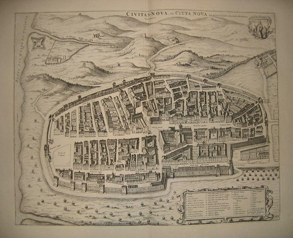 CIVITANOVA MARCHE - MORTIER, Pierre. 1724. "Civitas-Nova, ou Citta Nova Ville de l'Etat de l'Eglise dans la Marché d'Ancone. A Amsterdam, Par Pierre Mortier, Avec Privil." Titolo in alto, a destra immagine del B. Maro. In basso elenco dei luoghi notabili entro cornice ornamentale. Bella veduta a volo d'uccello della città e suoi dintorni, molto particolareggiata.