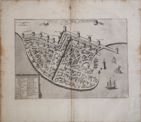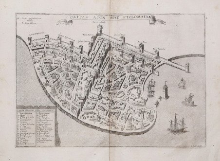 Rara pianta di Acri (nota in italiano anche come San Giovanni d'Acri o Tolemaide; in ebraico: ?, 'Akkô; in arabo: ?, ?Akk?) raffigurante la città sotto il controllo dei Cavalieri di San Giovanni. L'opera - incisa da Jean Picart - è pubblicata nel "Histoire des Chevaliers de l’Orde de S. Jean de Hierusalem, contenant leur admirable Institution & Police…" [Paris, Jacques d’Allin, MDCLIX] di Pierre de Boissat, traduzione francese della storia di Malta di Giacomo Bosio (1544-1627).San Giovanni d'Acri è una delle città più antiche città del mondo, che risale alla storia del faraone Thutmose III (1504-1450 a.C.). A suo tempo era uno dei maggiori porti del Medio Oriente, al pari di Alessandria e Costantinopoli. La città entrò a far parte dell'impero di Alessandro Magno dopo la sua conquista del 332 a.C. In seguito fu conquistata dal re egiziano Tolomeo II, che la ribattezzò Tolomeo nel II secolo a.C. Il nome fiorì fino alla conquista della città da parte dei musulmani nel VII secolo d.C. Nel 1104 la città fu conquistata dai Cavalieri di Malta e fu ribattezzata San Giovanni d'Acri. Nel 1291 i Mamelucchi invasero e distrussero la città, uccidendo tutti i crociati rimasti, ponendo fine alla sua antica storia.Acquaforte, ampi margini, piccoli strappetti al margine superiore, per il resto in ottimo stato di conservazione. Rare plan of Acre - engraved by Jean Picart - intended to illustrate a period when the town was under the control of the Knights of St. John. Shows extensive fortifcations, town plan, buildings and a key identifying significant landmarks.The work is published in the "Histoire des Chevaliers de l'Orde de S. Jean de Hierusalem, contenant leur admirable Institution & Police.". [Paris, Jacques d'Allin, MDCLIX] by Pierre de Boissat, French translation of the history of Malta by Giacomo Bosio (1544-1627).The book includes a series of plates showing the cities in which the Knights Hospitaller became most active (Jerusalem, Saint John of Acre, Rhodes, Cyprus and Malta). The plates are variations of illustrations already published in contemporary cartographic works and travel accounts.Acre or Akko is one of the oldest continuously inhabited cities in the World. The City dates its history back to Pharaoh Thutmose III (1504-1450 BC). In its time, it was one of the major ports in the Middle East, on a par with Alexandria and Constantinople. The town became a part of the empire of Alexander the Great after his conquest of 332 BC. It was later seized by Egyptian King Ptolemy II, who renamed the city Ptolemais in the 2nd Century BC. The name flourished until the Muslim's conquered the City in the 7th Century AD. In 1104, the town was conquered by the Knights of Malta and the town was renamed St. Jean d'Acre. In 1291, the Mamluks invaded and destroyed the City, killing all the remaining Crusaders, ending its ancient history.Etching, printed on contemporary laid paper, with margins, small tears in the upper edge, otherwise good condition. Cfr.