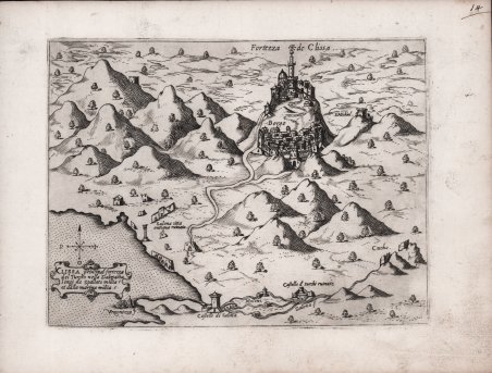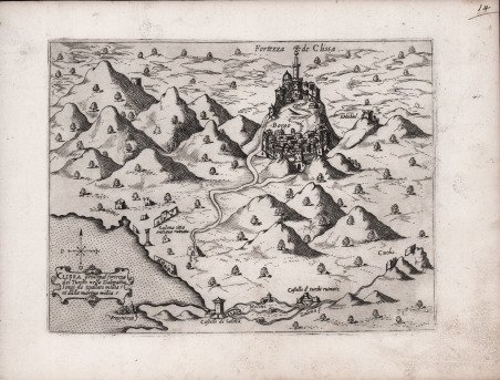 Mappa della fortezza di Klis (Clissa); raffigura la fortezza medievale situata poco distante da Spalato, baluardo difensivo molto famoso ai tempi delle invasioni turche del XVI secolo. In basso a sinistra una semplice rosa dei venti con il nord in alto. In un cartiglio si legge "CLISSA principal fortezza del Turcho nella Dalmatia longi da Spallato millia 5 et dalla marina millia 5". Priva di scala grafica e graduazione ai margini. Carta anonima, priva di data ed indicazioni editoriali, edita da Camocio. Deriva dall’opera di Domenico Zenoi, della quale è una pressochè esatta copia. La mappa circolava come carta sciolta prima di essere poi inserita nella raccolta Isole famose, porti, fortezze e terre marittime sottoposte alla Serenissima Signoria di Venetia, ed altri Principi Christiani, et al Signor Turco, nouamente poste in luce. In Venetia alla libreria del segno di San Marco. Esistono pertanto delle prove prive di numerazione, che si trovano in alcune raccolte cinquecentesche. Esistono altresì delle prove avanti il numero che si trovano negli isolari camociani. Alla morte dell’editore (1575) le lastre furono acquisite da Donato Bertelli, che le ristampò aggiungendo una numerazione sequenziale. Tra il 1560 ed 1575 Camocio pubblicò circa quaranta carte di grande formato e molte furono le carte di piccolo formato pubblicate sciolte tra il 1566 e il 1574, che andarono successivamente a formare il volume noto col nome Isole famose, porti, fortezze e terre marittime sottoposte alla Serenissima Signoria di Venetia, ed altri Principi Christiani, et al Signor Turco, nouamente poste in luce. In Venetia alla libreria del segno di San Marco. Le carte inserite nell’isolario di Camocio hanno la lastra ritoccata e un numero sequenziale aggiunto, mentre le prime prove sono caratterizzate dalla grande qualità di stampa e dall’assenza del numero.Magnifica prova su carta vergata coeva, in perfetto stato di conservazione. Primo stato avanti il numero.Bibliografia: S. Bifolco, Città e Fortezze Principali del Mondo, in Bifolco-Ronca "Cartografia e Topografia Italiana del XVI secolo. Catalogo ragionato delle opere a stampa" (2018), pp. 126, 140-141. The Klis Fortress (Croatian: Tvr?ava Klis) is a medieval fortress situated above a village bearing the same name, near the city of Split, and is probably best known for its defense against the Ottoman Empire in the early 16th century.Rare first state before the number. From Camocio's "Isole Famose".This work, as was usual for Camocio and his other contemporary publishers, was on the market as loose map and later included in the "Isole famose, porti, fortezze e terre marittime sottoposte alla Serenissima Signoria di Venetia, ed altri Principi Christiani, et al Signor Turco, nouamente poste in luce. In Venetia alla libreria del segno di San Marco". The issue with the numbers are, instead, those inserted in the editions of the book published by Donato Bertelli - showing the imprint In Venetia alla libreria del segno di San Marco. This edition, although without date, dates back to after 1575, the year in which the Camocio disappeared during the pestilence epidemic in Venice and much of its typography was acquired by Bertelli.Etching with engraving, in good condition.Bibliografia: S. Bifolco, Città e Fortezze Principali del Mondo, in Bifolco-Ronca "Cartografia e Topografia Italiana del XVI secolo. Catalogo ragionato delle opere a stampa" (2018), pp. 126, 140-141. Cfr. Gallo (1950): p. 97, n. 14 e p. 99, n. 3; Novak (2005): p. 304, fig. 11; Tolias (2011): n. 0363.