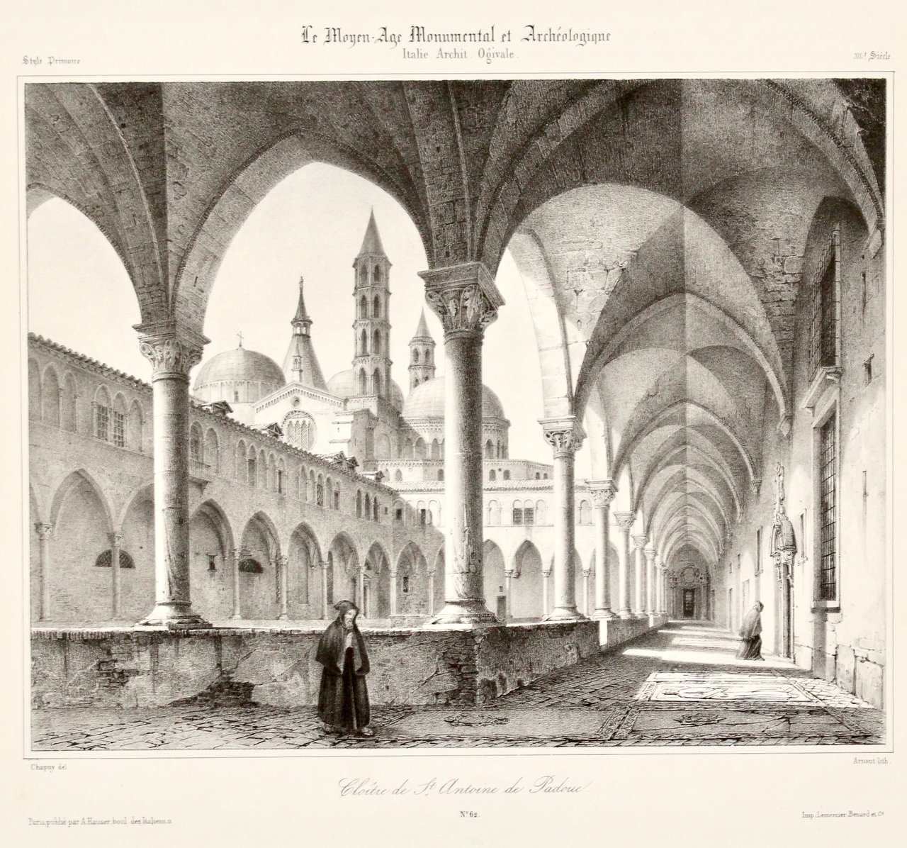 Litografia, mm 275x215 su foglio di mm 430x290; in basso a sinistra : "Chapuy del./Paris pubblié par A. Hauser boul. des Italiens, 11; titolo: "Cloitre de St. Antoine de Padoue/n. 62" in basso a destra: "Arnout lith. : Imp. Lemercier Bernard et C". Bella veduta del Chiostro della Basilica di Sant'Antonio. Tratta da una corposa raccolta di vedute dal titolo "Le Moyen Monumental et Archéologique" eseguita su proprio disegno da Chapuy e litografata da Arnout. Bell'esemplare. Timbrino editoriale a secco in basso sotto il titolo. Chapuy architetto del Corpo di Genio francese a causa del suo bonapartismo, dopo il 1815 dovette orientarsi verso una nuova attività. Grazie alle sue abilità grafiche-artistiche si dedicò alle illustrazioni di paesaggi e monumenti, lavorando su commissione dapprima per editori che legati al campo dell'archeologiae, dopo il 1823 alle pubblicazioni per i libri di viaggio. <BR>