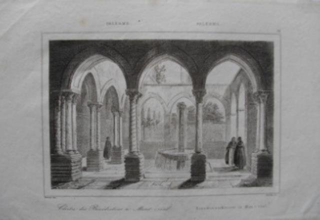 Seconda meta' dell' '800. Dalla "Italie Pittoresque", incisione su rame, b/n, cm 13,5 x 20,5 (il foglio). Piccola veduta del Chiostro dei Benedettini a Monreale, presso Palermo.