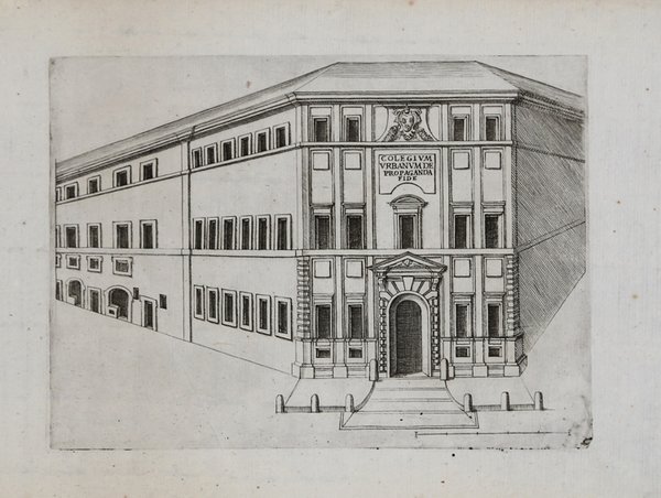 Veduta tratta dalla rarissima serie Palazzi divesi nel'Alma Cità di Roma et altre, pubblicata per la prima volta a Roma: ad instanza di Giombattista de Rossi in piazza Nauona, 1638. La raccolta venne successivamente ristampata nel 1640, 1650 e nel 1655 sempre a cura della tipografia De Rossi e anche nel 1773 da Carlo Losi. Esemplare dell'edizione originale del 1638. L'opera comprende incisioni di famosi palazzi romani e non, incluse diverse vedute della Piazza San Marco di Venezia, la Certosa di Pavia, il Santuario di Loreto. Acquaforte e bulino, in ottimo stato di conservazione. View taken from the very rare set Palazzi divesi nel'Alma Cità di Roma et altre, published for the first time in Rome: ad instanza di Giombattista de Rossi in Piazza Nauona, 1638. The collection was subsequently reprinted in 1640, 1650 and 1655 always by the De Rossi typography and also in 1773 by Carlo Losi. Example of the original edition of 1638. The work includes engravings of famous palaces in Rome and elsewhere, including several views of Piazza San Marco in Venice, the Certosa of Pavia, the Sanctuary of Loreto. Etching and angraving, in excellent condition. Cfr.