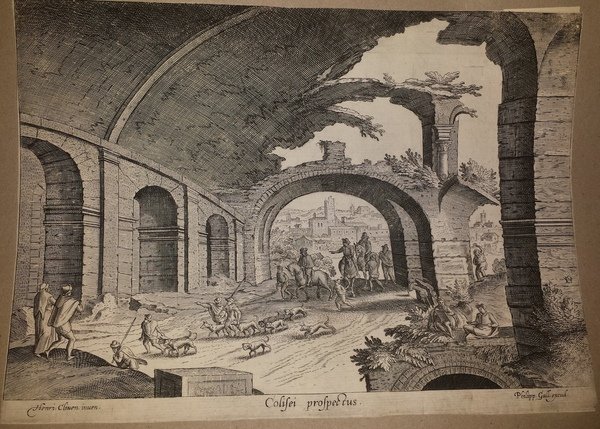Acquaforte, 170 x 238 mm. Prima edizione. Stato I/II. Filigrana con monogramma di Hendrick Van Cleve: mano con quadrifoglio. In basso sotto l'immagine incisa: a sinistra "Henri. Cliven. inven", al centro il titolo, a destra "Philipp. Gall. excud.". Fa parte di "Ruinarium varii prospetto ruriumque aliquot delineationes" Hendrick o Hendrik van Cleve III (1525-1589) era un pittore e incisore fiammingo, figlio e allievo di Willem van Cleve il Vecchio e fratello maggiore di Marten van Cleve il Vecchio e di Willem Van Cleve il Giovane. Viene chiamato "il terzo" per differenziarlo da Hendrik van Cleve I (registrato come maestro della Corporazione di San Luca 1489/90) e Hendrick II (Gilda di San Luca, 1534). Hendrick III andò in Italia da giovane, e tornò nel suo paese natale, buon pittore di paesaggi. Le sue immagini si distinguono per una leggerezza insolita del tatto e un eccellente tono di colore. Gli sfondi delle opere storiche di suo fratello Marten e di Frans Floris sono spesso dipinti da questo artista e sono armonizzati con le figure con grande intelligenza. "Storia del figlio prodigo" nel Belvedere di Vienna è sua. Fu accolto nella Gilda di San Luca ad Anversa nel 1551. Hendrick van Cleve si è distinto come incisore. Molte delle sue incisioni si riferiscono a paesaggi e vedute vicino a Roma. Una serie di trentotto tavole di questo artista, dal titolo Ruinarum varii prospectus, ruriumque aliquot delineationes, pubblicato da Theodoor Galle. Morì ad Anversa tra il 1590 e il 1595. Hollstein, Dutch and Flemish etching engravings and woodcuts ca. 1540-1700, v. 4., p. 170