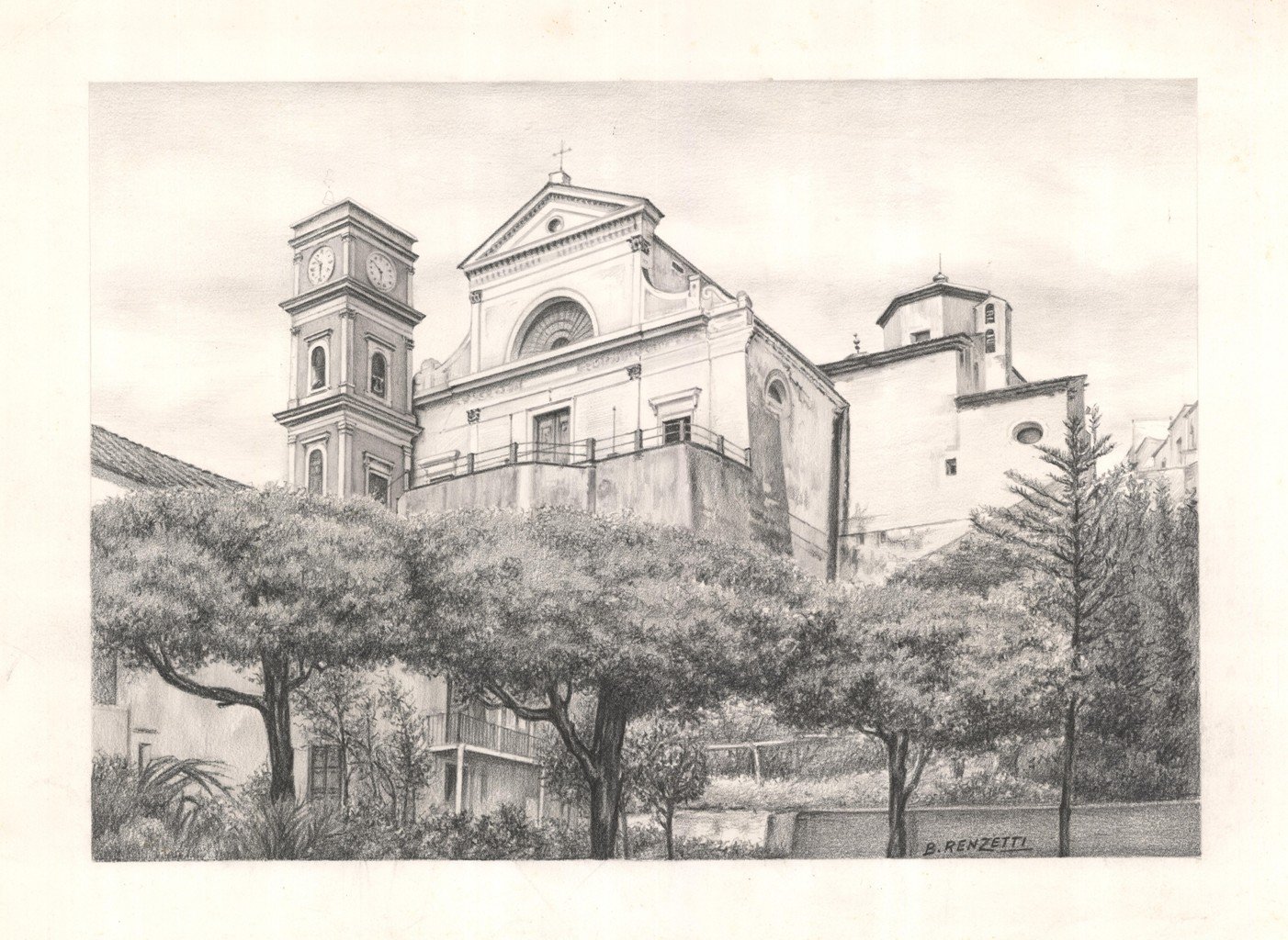 Disegno raffigurazione la facciata della Colleggiata S. Maria a mare a Miori in provincia di Salerno. Autore: Renzetti B. Luogo: Maiori - Salerno. Anno: '900. Tecnica: disegno a matita. Dimensioni: 350x495 mm