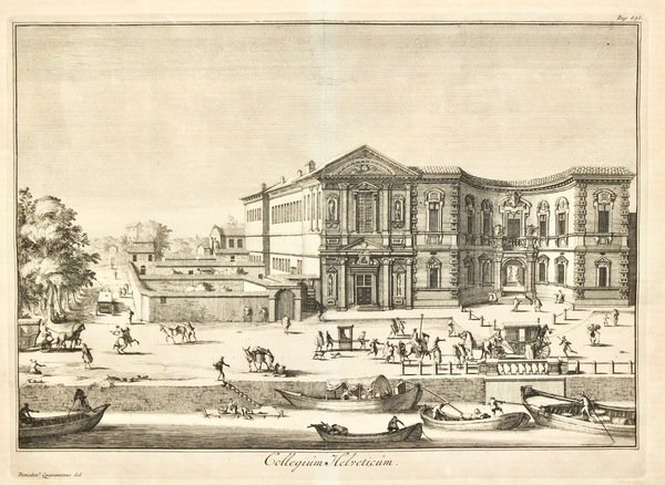 Incisione in rame, 255x350. Bella veduta del Collegio Elvetico delineata da Benedetto Quarantino. Ottimo esemplare con piega centrale editoriale, lievemente ingiallita. Estratto da: GRAEVIUS JOANNES GEORGIUS. Thesaurus antiquitatum et historiarum Italiae. <BR>