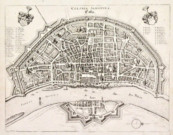 Incisione in rame, 275x355. Pianta della città con stemmi gentilizi ai lati sup. e legende. Tratta da "Neuwe Archontologia cosmica" di Johann Gottfried. Bell'esemplare ben inchiostrato. Lievissime tracce di sporco sup. ai margini.