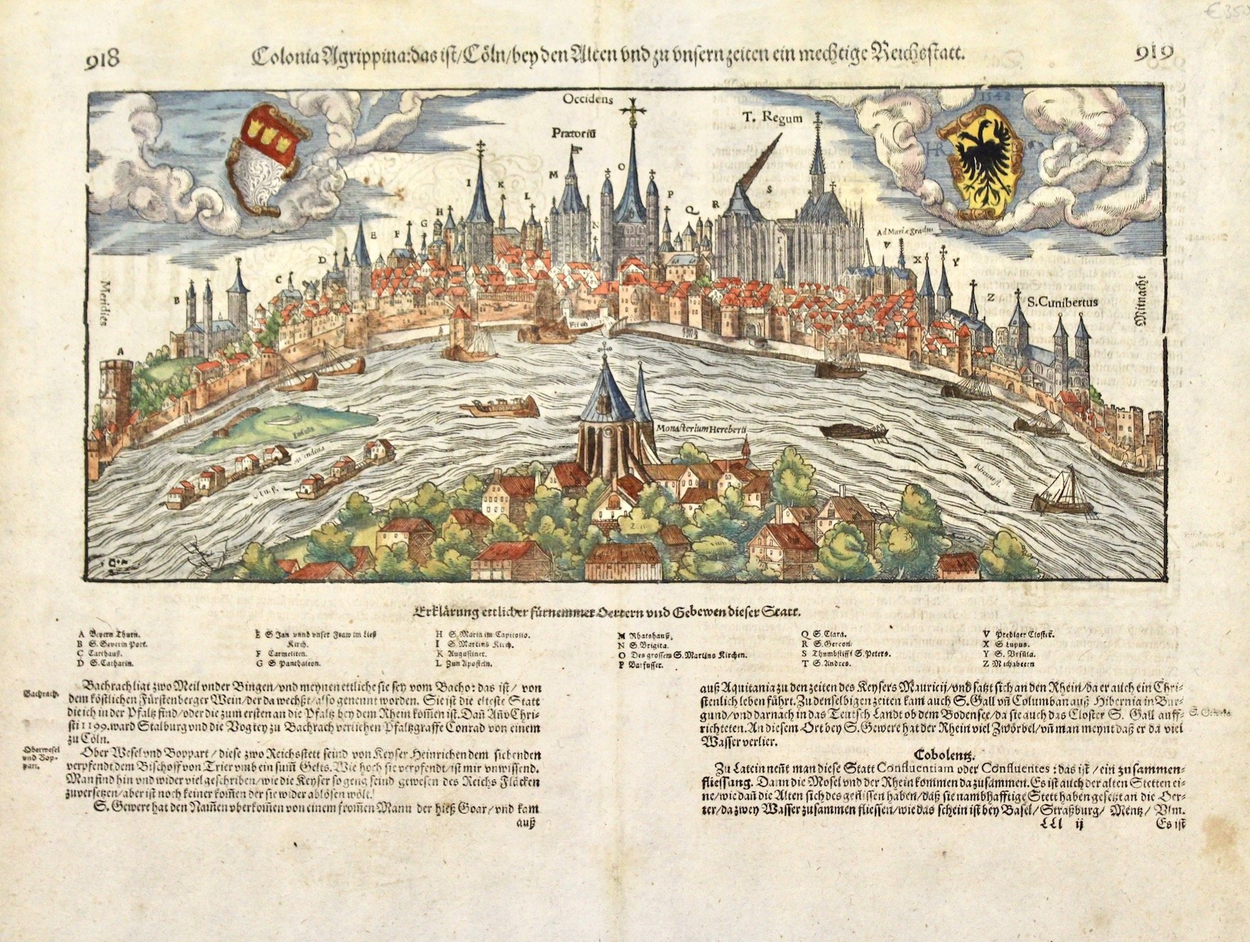 Silografia, mm 170x370 (immagine) su foglio (mm 360x440) a pieni margini, colorata. Tratta da una edizione tedesca della "Cosmographia universalis". Ottimo esemplare.<BR>Woodcut, mm 170x370 (image) on full margin sheet (mm 360x440), colored. NIce general view decorated with two coat of arms. From a german edition of Sebastian Münster's Cosmographey oder beschreibung aller Länder, published by Heinrich Petri in Basel. Good condition<BR>