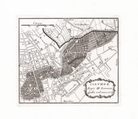 Pianta del rione tratta dalla celebre guida di Roma di Dominique Magnan La ville de Rome, ou, Description abre?ge?e de cette superbe ville: divise?e en quatre volumes: et orne?e de 425 planches en taille douce. A Rome: De l'imprimerie d'Archange Casaletti . : Chez Venan. Monaldini, Bouchard et Gravier : Gregoire Settari ., 1778. Dominique Magnan (1731–1796), dotto abate francese del convento della Trinità dei Monti, dell'ordine dei minimi, a Roma, che fu profondamente coinvolto nella vita intellettuale della sua comunità durante la seconda metà del XVIII secolo. Ha studiato all'università di Avignone, poi si è unito ai Minimi di La Ciotat all'età di 20 anni, dove ha iniziato la sua carriera come collezionista di monete e medaglie antiche. Nominato professore di teologia a Marsiglia, ha continuato il suo lavoro. Si mise in contatto con i più famosi antiquari dell'epoca, sia in Italia che in Germania, e acquisì rapidamente una vasta reputazione. I suoi primi libri hanno ricevuto il plauso della critica. Ma i suoi lavori più significativi erano sulla numismatica sebbene fortemente criticati dagli specialisti dell'epoca in quanto la copertura universale e completa del soggetto poteva mantenere la confusione tra monete autentiche e false. ' Bibliografia: Rossetti, G-1285; ' Schudt ' 363. Map taken from the famous guide of Rome by Dominique Magnan La ville de Rome, ou, Description abre?ge?e de cette superbe ville: divise?e en quatre volumes: et orne?e de 425 planches en taille douce. A Rome: De l'imprimerie d'Archange Casaletti . : Chez Venan. Monaldini, Bouchard et Gravier : Gregoire Settari ., 1778. ' Dominique Magnan (1731–1796), a learned French abbot of the Trinità dei Monti convent, of the order of the minims, in Rome, who was deeply involved in the intellectual life of his community during the second half of the 18th century. ' He studied at the University of Avignon, then joined the Minims of La Ciotat at age 20, where he began his career as a collector of ancient coins and medals. Appointed professor of theology in Marseille, he continued his work. He got in touch with the most famous antiquaries of the time, both in Italy and Germany, and speedily acquired an extensive reputation. His first books received critical acclaim. But his most significant works were on numismatics though heavily criticized by specialists of the time in that universal and complete coverage of the subject could maintain confusion between authentic coins and the fake ones. ' Bibliografia: Rossetti, G-1285; ' Schudt ' 363. Cfr.