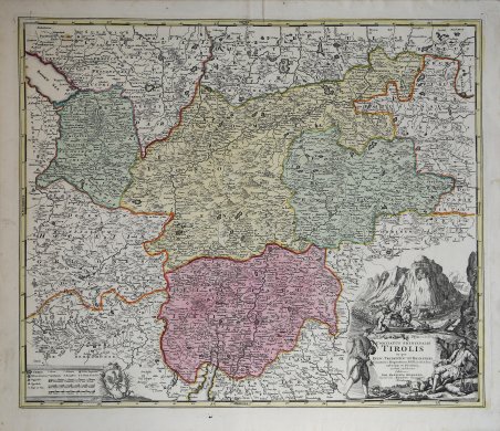 La carta fu realizzata da Homann per il suo Grosser Atlas. Johann Baptist Homann è stato un geografo e cartografo tedesco; nel 1702 fondò la sua casa editrice. Homann acquisì fama come uno dei principali cartografi tedeschi, e nel 1715 fu nominato geografo imperiale dall'imperatore Carlo VI. Nello stesso anno fu anche nominato membro dell'Accademia Prussiana delle Scienze a Berlino. Nel 1716 Homann pubblicò il suo capolavoro Grosser Atlas ueber die ganze Welt. Numerose mappe furono redatte in collaborazione con l'incisore Christoph Weigel. Homann morì a Norimberga nel 1724. Gli successe suo figlio Johann Christoph (1703-1730). L'azienda continuò dopo la sua morte come azienda degli eredi Homann, gestita da Johann Michael Franz e Johann Georg Ebersberger. Dopo successivi cambiamenti nella gestione, l'azienda si sciolse nel 1852. The map was made by Homann for his Grosser Atlas. Johann Baptist Homann was a German geographer and cartographer; in 1702 he founded his own publishing house. Homann acquired renown as a leading German cartographer, and in 1715 was appointed Imperial Geographer by Emperor Charles VI. In the same year he was also named a member of the Prussian Academy of Sciences in Berlin. In 1716 Homann published his masterpiece Grosser Atlas ueber die ganze Welt; numerous maps were drawn up in cooperation with the engraver Christoph Weigel the Elder. Homann died in Nuremberg in 1724 and was succeeded by his son Johann Christoph (1703-1730). The company carried on upon his death as Homann heirs company, managed by Johann Michael Franz and Johann Georg Ebersberger. After subsequent changes in management the company folded in 1852. Etching with fine original colour, good condition. Cfr.