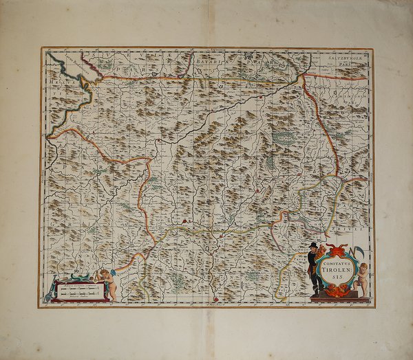 RARA EDIZIONE EREDI JANSSONIUS. Carta geografica per la prima volta inserita nel "Novus Atlas sive Theatrum Orbis Terrarum", pubblicato dal Janssonius nel 1641. Questo esemplare deriva dal "La Guerre d'Italie Raprèsentèe en plusieures cartes" edita ad Amsterdam nel 1702 da Jansonius van Waeberge, eredi della tipografia Janssonius. La carta presenya un fitto reticolato ed è priva dle testo al verso. Rispetto ai modelli precedenti e contemporanei, la carta non presenta originalità nei rilevamenti, mentre territorialmente si estende al Tirolo di Nord e Sud, e del Trentino comprende solo la zona a Nord di Trento. Joannes Janssonius, figlio dell'editore di Arnhem Jan Janssen, sposò Elisabeth Hondius, figlia di Jodocus Hondius, ad Amsterdam nel 1612. Dopo il suo matrimonio, si stabilì in questa città come libraio ed editore di materiale cartografico. Nel 1618 si stabilì ad Amsterdam accanto alla libreria di Willem Jansz. Blaeu, entrando in una seria competizione. Le sue attività non riguardavano solo la pubblicazione di atlanti e libri, ma anche di mappe singole e un vasto commercio di libri con filiali a Francoforte, Danzica, Stoccolma, Copenaghen, Berlino, Koningsbergen, Ginevra e Lione. Nel 1631 iniziò a pubblicare atlanti insieme a Henricus Hondius. Nei primi anni 1640 Henricus Hondius lasciò l'attività di pubblicazione di atlanti completamente a Janssonius. La concorrenza con Joan Blaeu, figlio e successore di Willem, nella produzione di atlanti spinse Janssonius ad ampliare il suo Atlas Novus finalmente in un'opera di sei volumi, in cui furono inseriti un atlante marino e un atlante del Vecchio Mondo. Dopo la morte di Joannes Janssonius, il negozio e la casa editrice furono continuati dagli eredi sotto la direzione di Johannes van Waesbergen (c. 1616-1681), genero di Joannes Janssonius. Le matrici degli atlanti di Janssonius furono in seguito vendute a Schenk e Valck. Decorativo il grande cartiglio col titolo, con due figure ai lati a sostenerlo. Incisione in rame, finemente colorata a mano, in ottime condizioni. RARA EDIZIONE EREDI JANSSONIUS. Carta geografica per la prima volta inserita nel "Novus Atlas sive Theatrum Orbis Terrarum", pubblicato dal Janssonius nel 1641. Questo esemplare deriva dal "La Guerre d'Italie Raprèsentèe en plusieures cartes" edita ad Amsterdam nel 1702 da Jansonius van Waesberge, eredi della tipografia Janssonius. La carta presenya un fitto reticolato ed è priva dle testo al verso. Rispetto ai modelli precedenti e contemporanei, la carta non presenta originalità nei rilevamenti, mentre territorialmente si estende al Tirolo di Nord e Sud, e del Trentino comprende solo la zona a Nord di Trento. Decorativo il grande cartiglio col titolo, con due figure ai lati a sostenerlo. Incisione in rame, finemente colorata a mano, in ottime condizioni. Joannes Janssonius (Arnhem, 1588-1664), son of the Arnhem publisher Jan Janssen, married Elisabeth Hondius, daughter of Jodocus Hondius, in Amsterdam in 1612. After his marriage, he settled down in this town as a bookseller and publisher of cartographic material. In 1618 he established himself in Amsterdam next door to Blaeu’s book shop. He entered into serious competition with Willem Jansz. Blaeu. His activities not only concerned the publication of atlases and books, but also of single maps and an extensive book trade with branches in Frankfurt, Danzig, Stockholm, Copenhagen, Berlin, Koningsbergen, Geneva, and Lyon. In 1631 he began publishing atlases together with Henricus Hondius. In the early 1640s Henricus Hondius left the atlas publishing business completely to Janssonius. Competition with Joan Blaeu, Willem’s son and successor, in atlas production prompted Janssonius to enlarge his Atlas Novus finally into a work of six volumes, into which a sea atlas and an atlas of the Old World were inserted. After the death of Joannes Janssonius, the shop and publishing firm were continued by the heirs under the direction of Johannes van Waesbergen (c. 1616-1681), son-in-law of Joannes Janssonius. The copperplates from Janssonius’s atlases were afterwards sold to Schenk and Valck. Cfr. Koeman, Ja 21; G. Tomasi, Il Territorio Trentino-Tirolese nell'antica cartografia, sc. 29