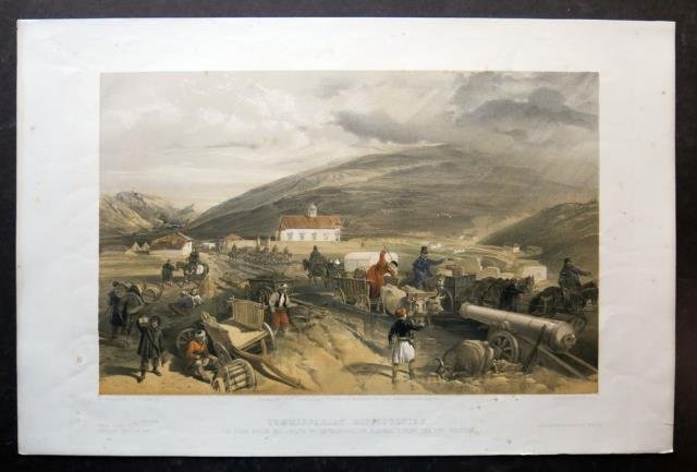 Tratta da “Seat of War in the East”. Paul & Dominic Colnaghi & C.°, London 1855 – 1856. Tonolitografia in recente ma bella coloritura a mano, cm 37 x 55,5 circa (il foglio). Disponiamo di numerose tavole appartenenti alla prima o seconda serie. Le tavole sono tutte delineate da William Simpson e litografate da vari autori, tra cui E. Walker, J. Needham, T. Picken e altri. Tranne un minimo e lieve foxing, bella coloritura e in buono stato di conservazione.